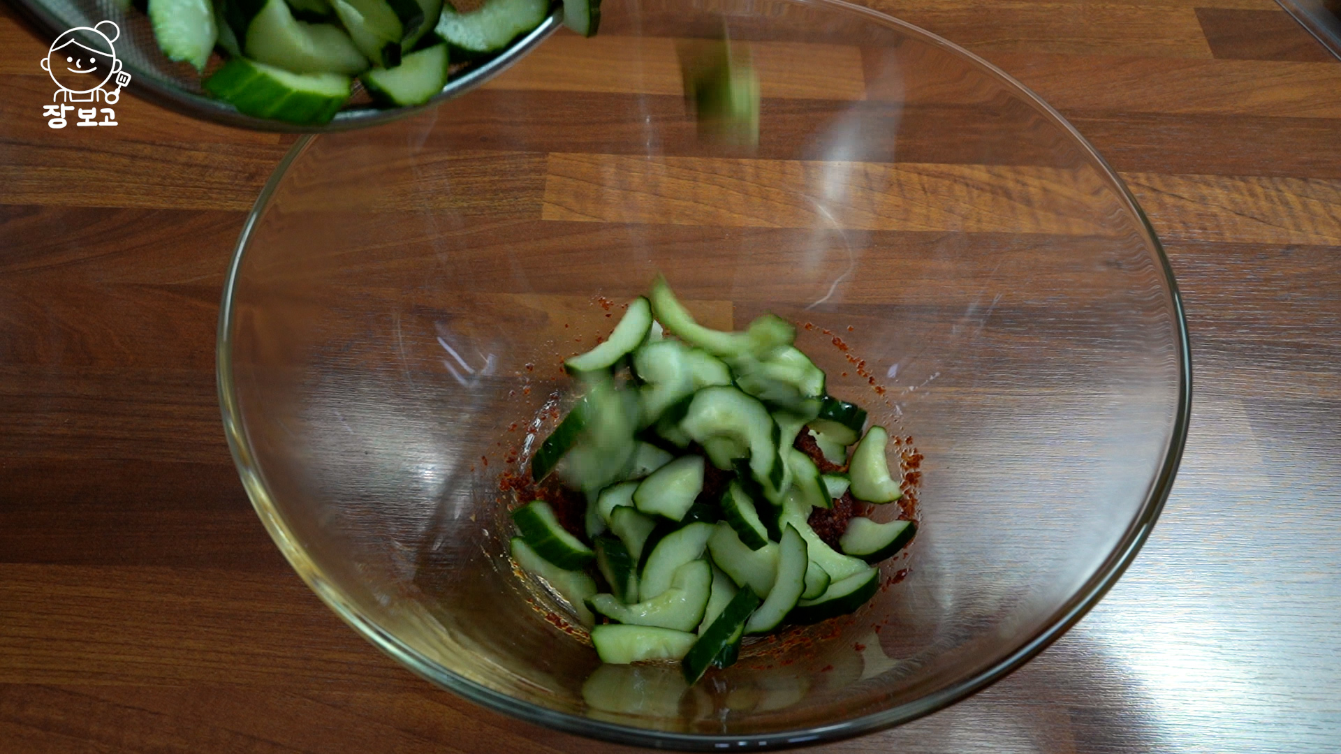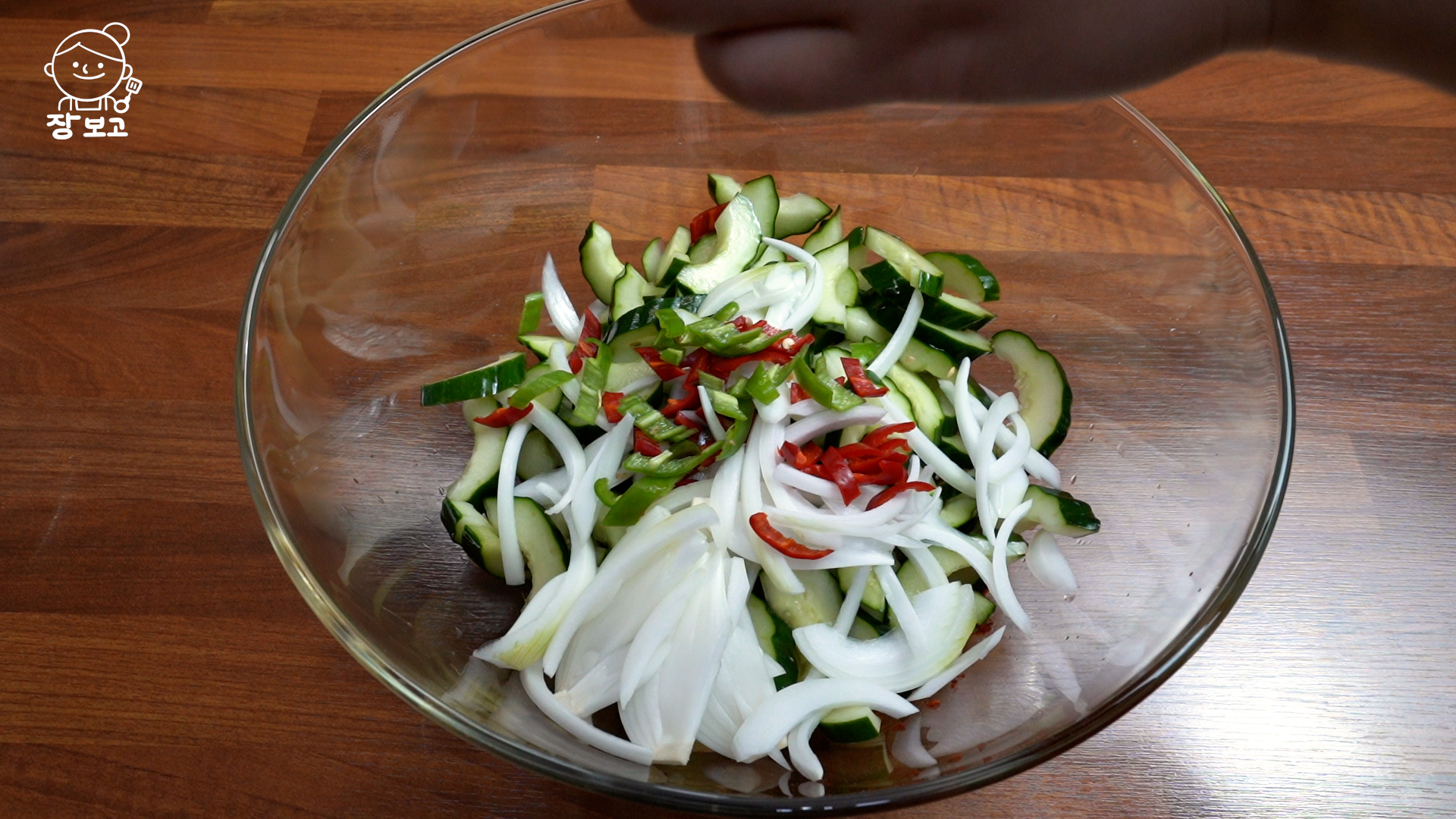 6. 체에 밭쳐 둔 오이 넣고 썰어 둔 양파, 고추 넣어서 잘 버무린다.