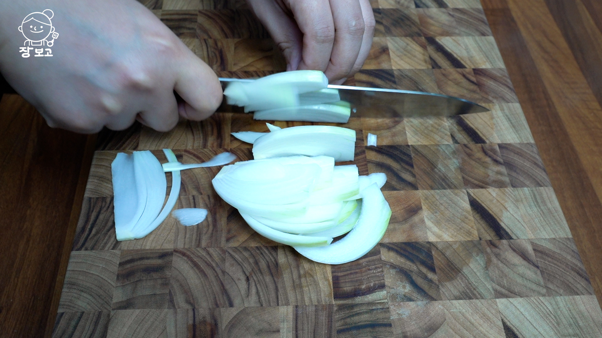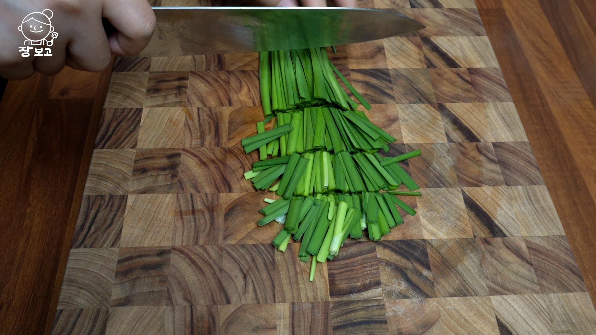 3. 양파 반 개는 얇게 썰고, 부추 한 줌은 오이보다 짧은 길이로 썬다.