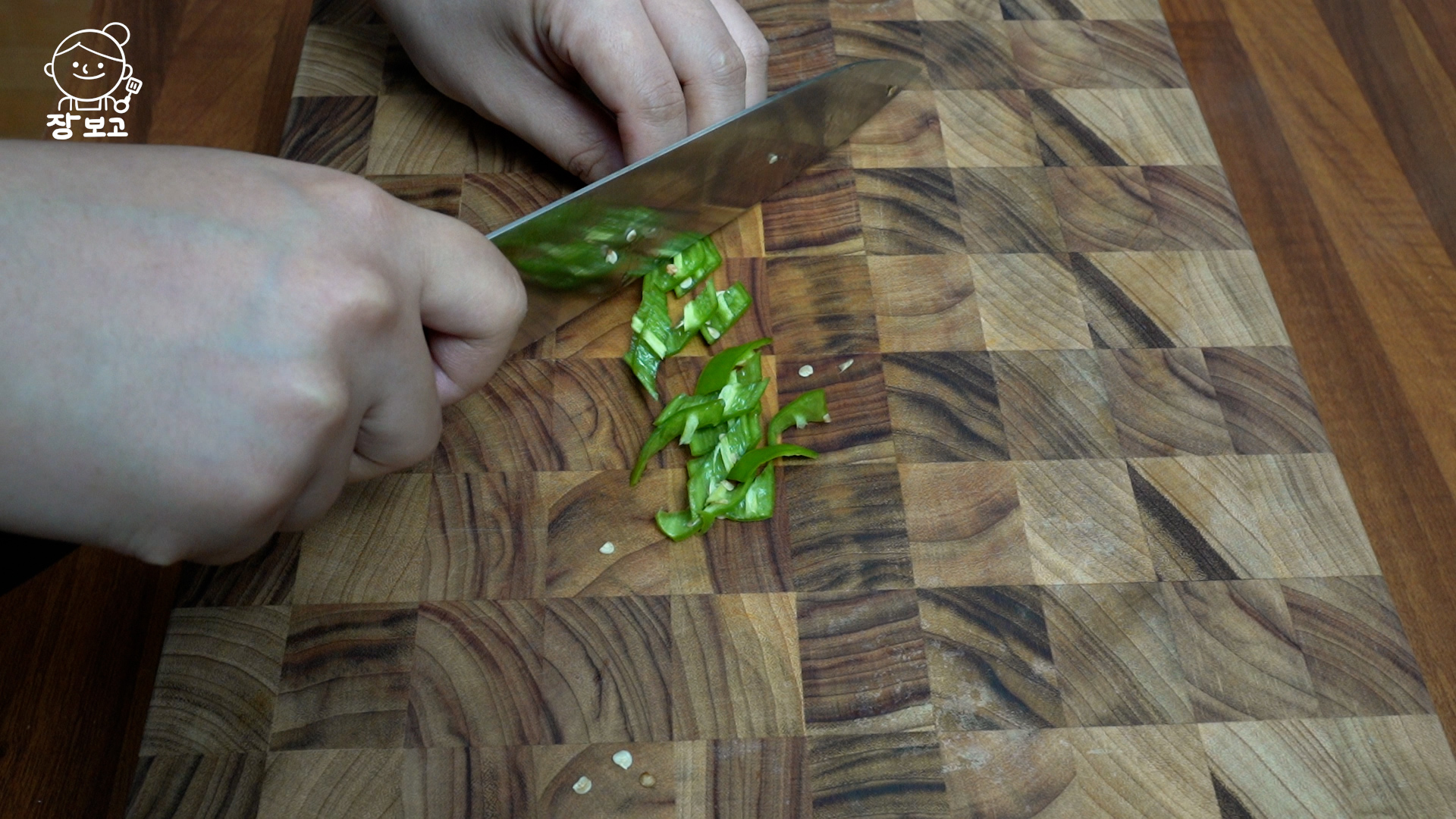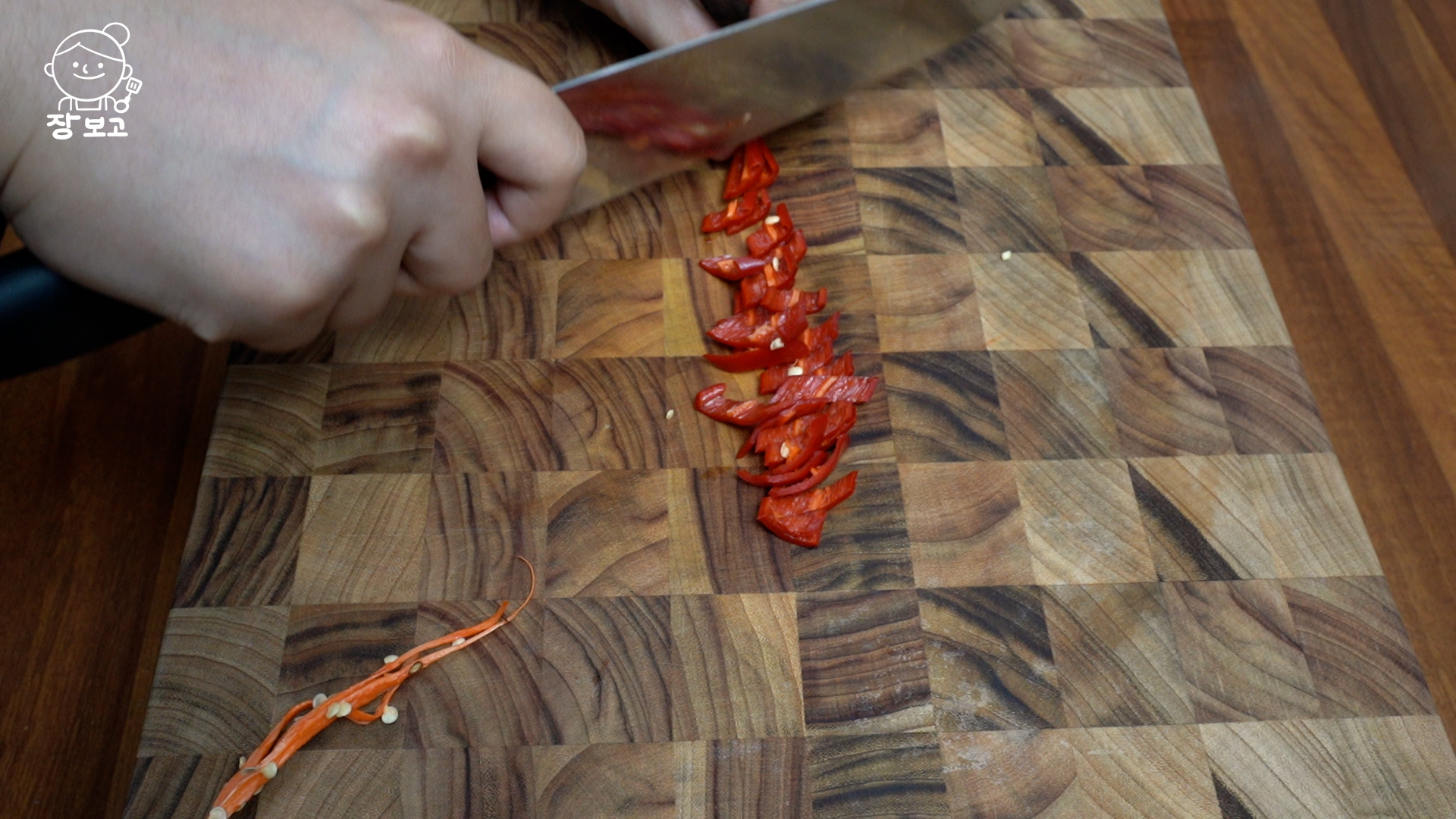 4. 홍고추 한 개는 씨를 뺀 뒤 어슷 썰고 청양고추 한 개도 똑같이 썬다.
