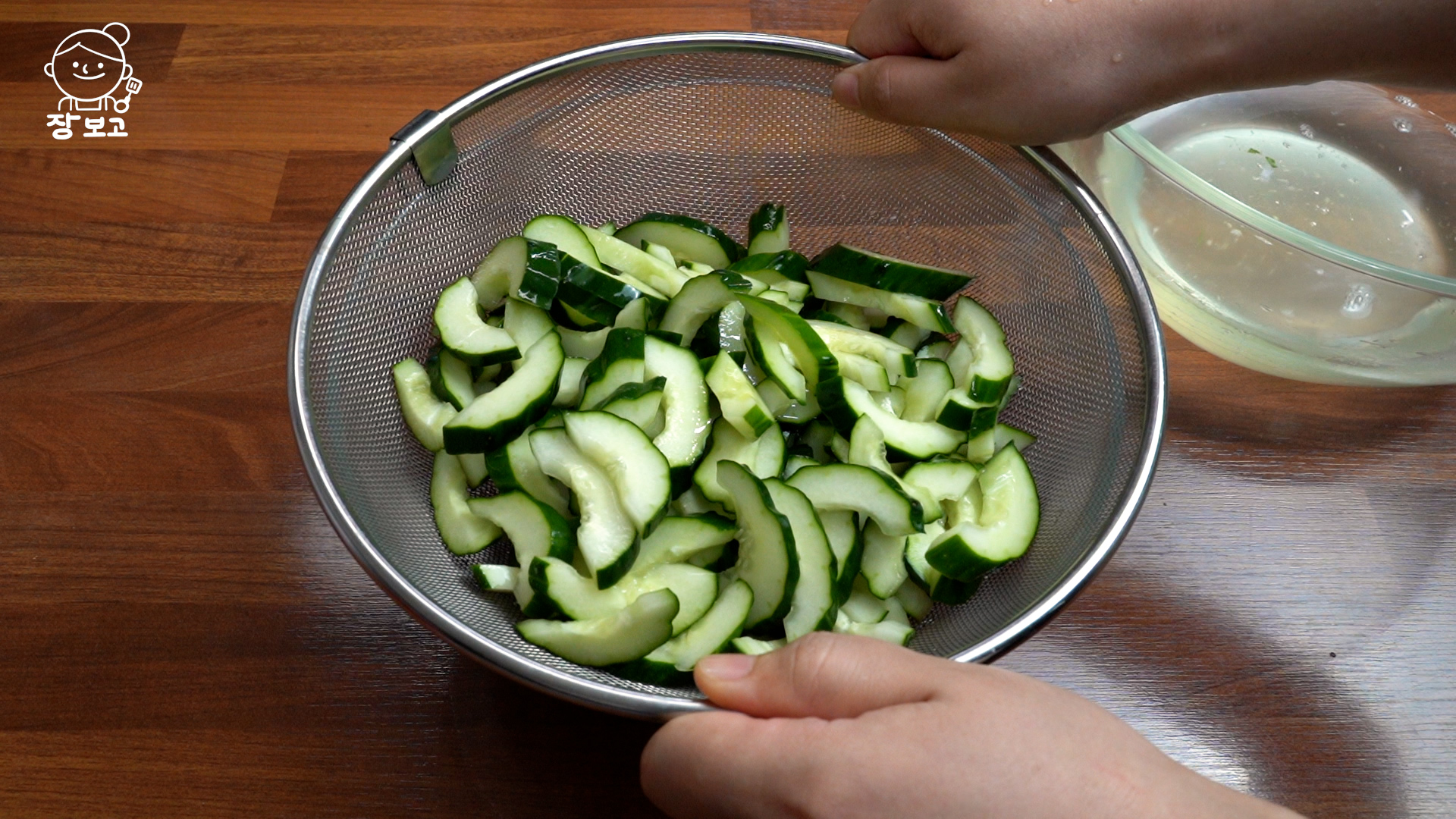 2. 물 / 600ml에 소금 / 1 큰술 넣고 잘 저어서 소금물을 만들어 오이에 부어서 헹군다. (절이지 말고 가볍게 헹궈주면 오이의 아삭함은 살리면서 과한 수분만 빼낼 수 있다) 체에 밭쳐 물기를 뺀다.