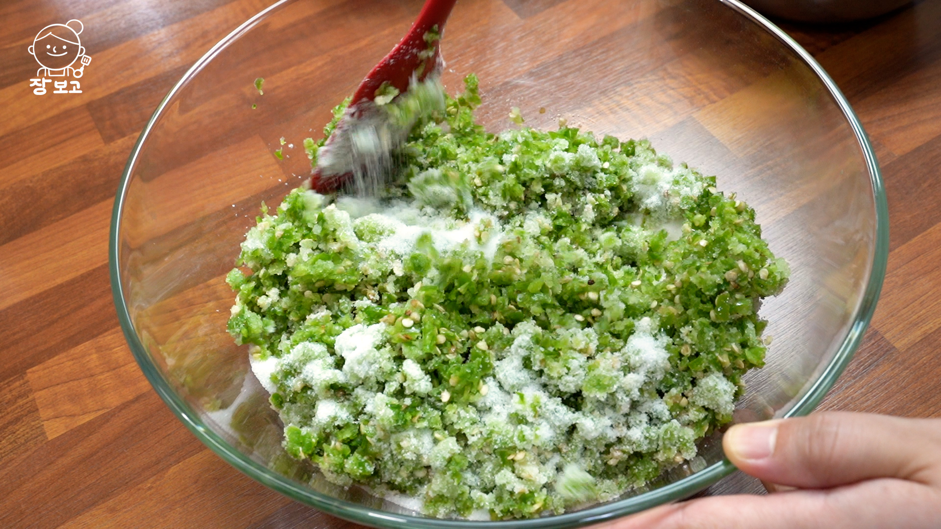 2. 다진 고추 1kg에 설탕 500g을 넣고 가볍게 섞어준 뒤 올리고당 600g을 넣고 섞는다. 한 시간 정도 중간중간 섞어주며 설탕을 완전히 녹인다. (당류가 적으면 변질되기 쉽기에 비율을 꼭 맞춘다)
