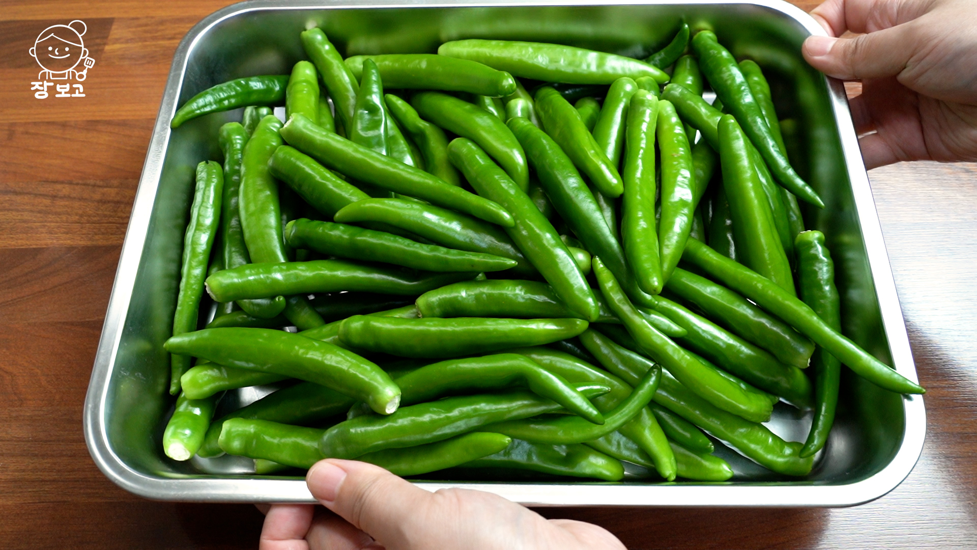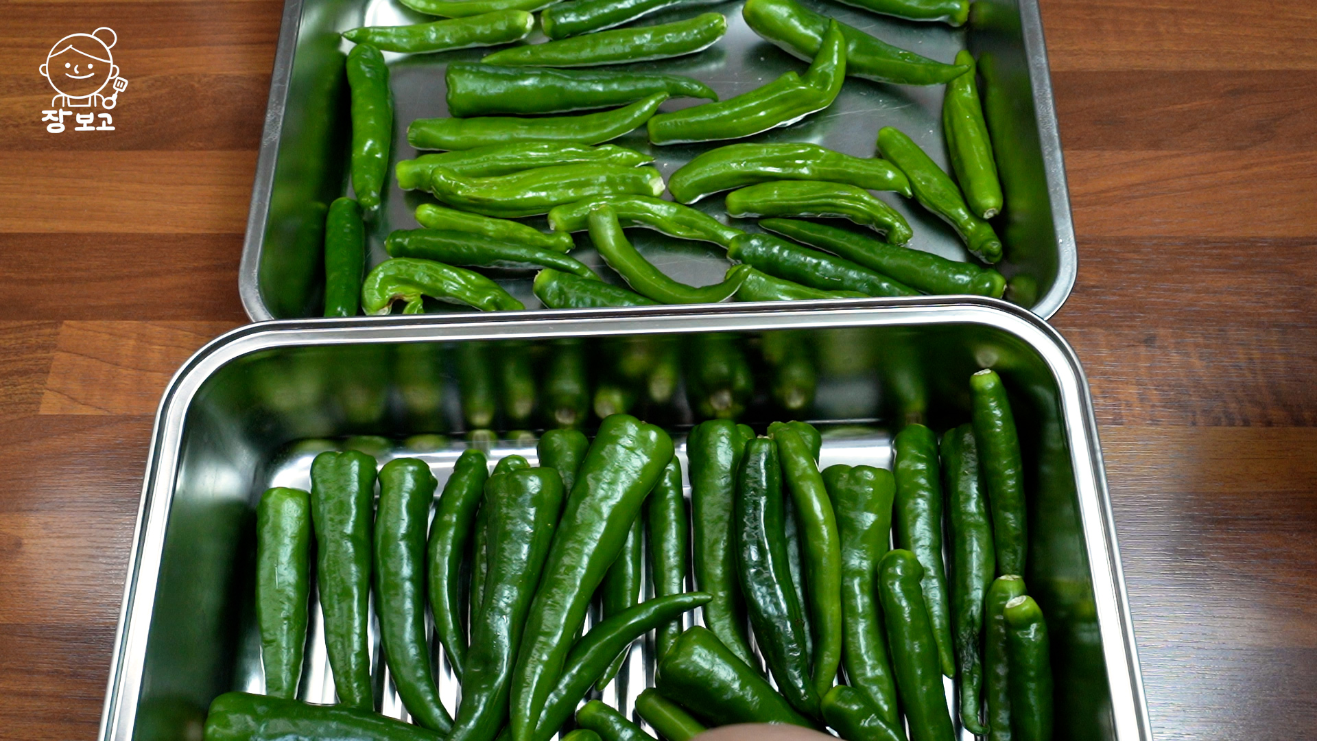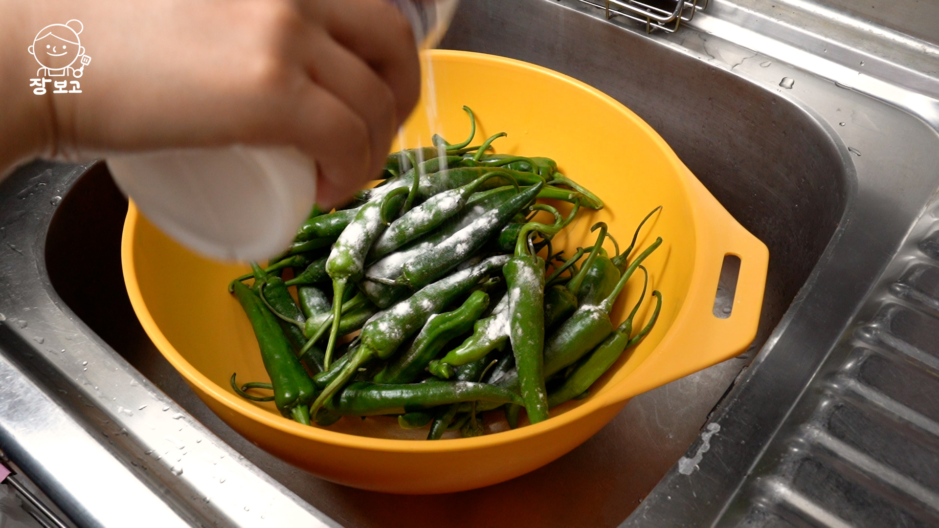 1. 고추는 베이킹소다 1큰술 넣고 10분간 담가 잔류농약과 불순물을 제거한다. 흐르는 물에 깨끗이 씻고 키친타월로 물기를 제거한 뒤 꼭지를 제거한다. (미리 꼭지를 따고 씻으면 물이 들어가 변질될 수 있다) 물기를 완전히 말려준다.