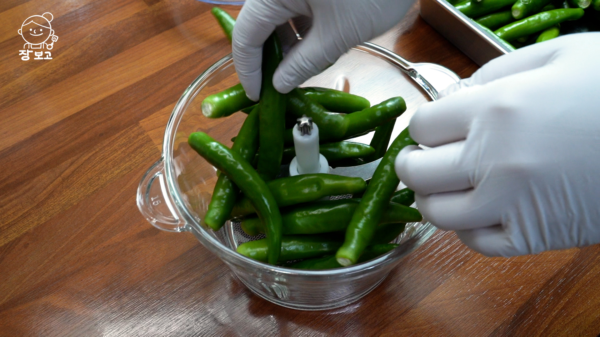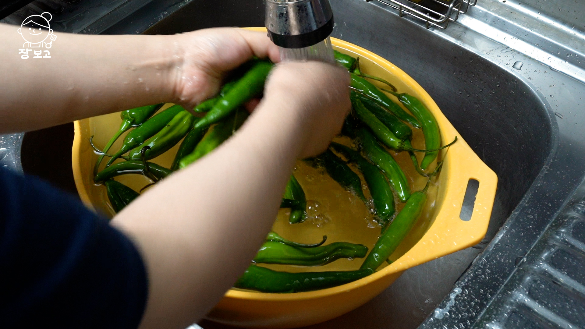 1. 고추는 베이킹소다 1큰술 넣고 10분간 담가 잔류농약과 불순물을 제거한다. 흐르는 물에 깨끗이 씻고 키친타월로 물기를 제거한 뒤 꼭지를 제거한다. (미리 꼭지를 따고 씻으면 물이 들어가 변질될 수 있다) 물기를 완전히 말려준다.