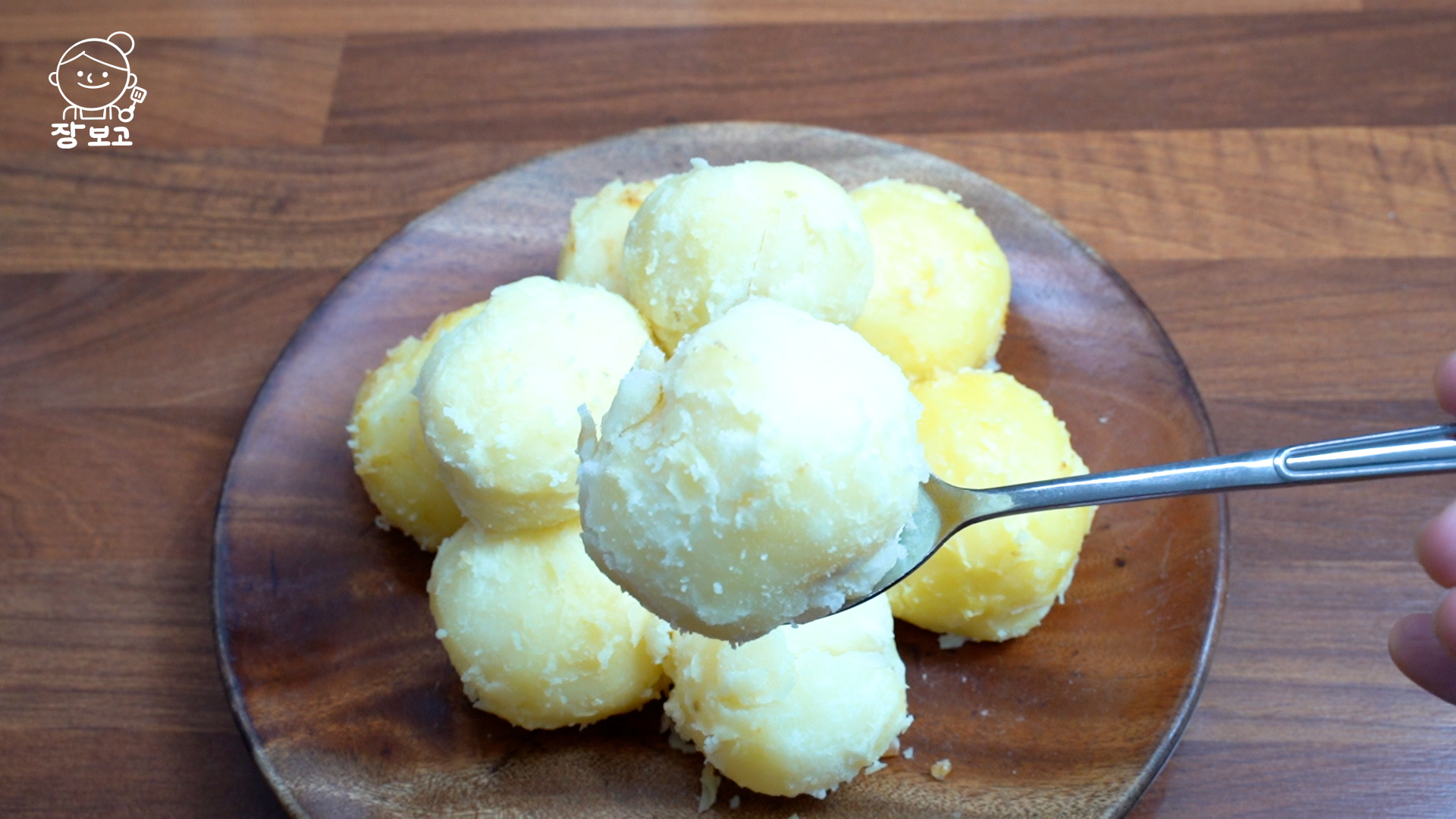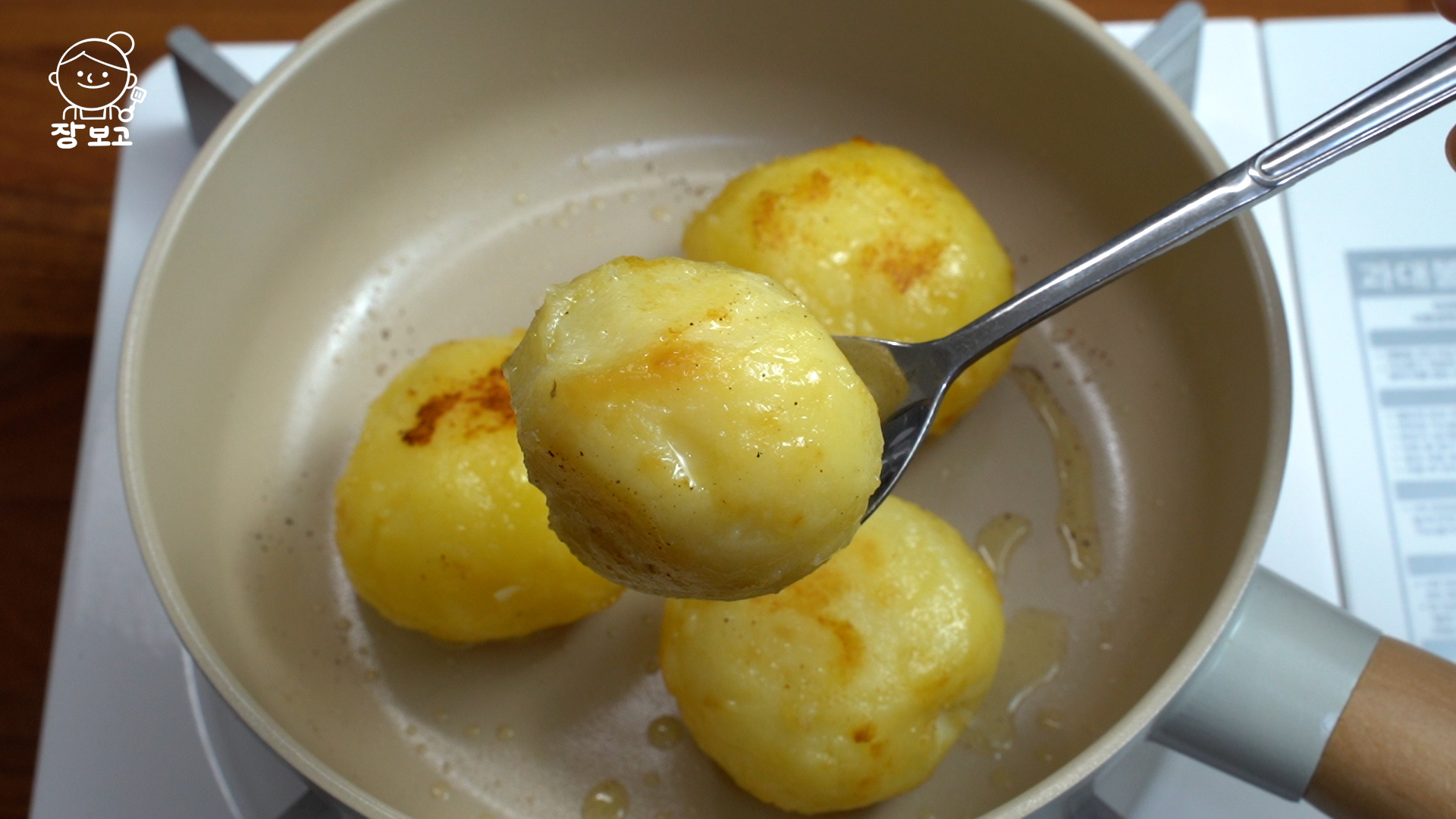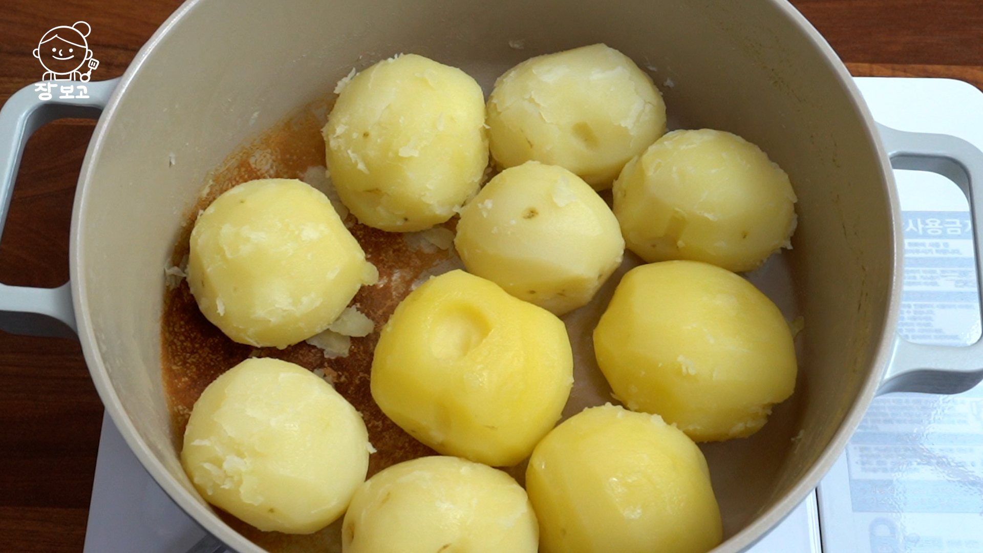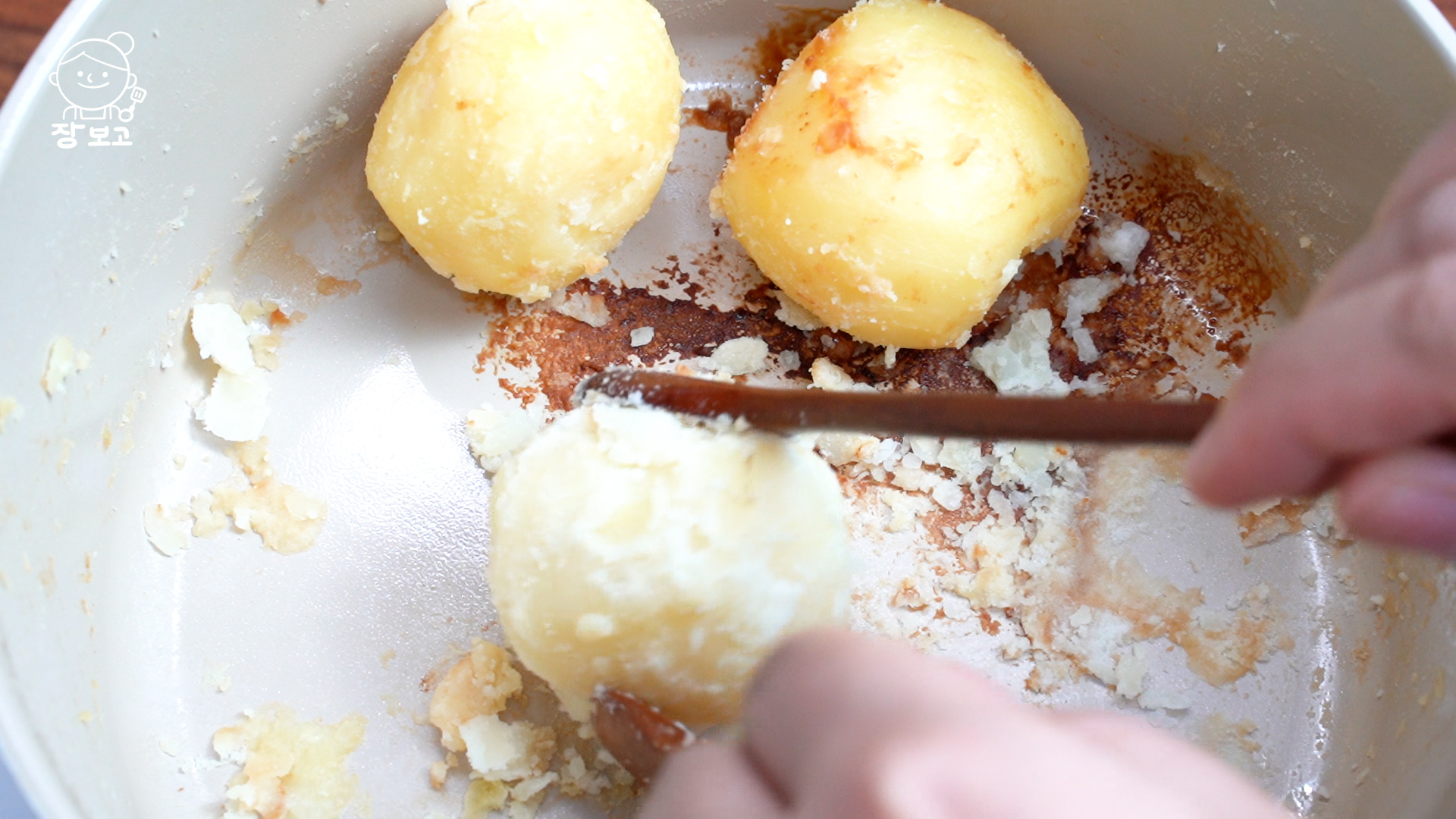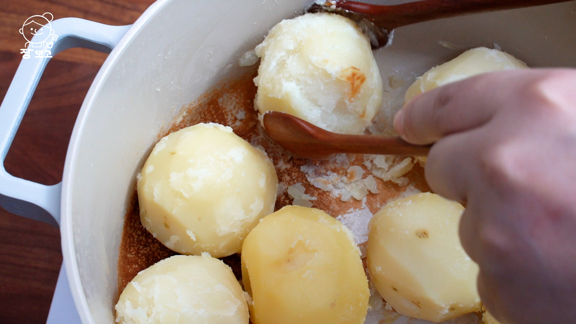 4. 감자에 수분이 아예 없어지면 바닥이 살짝 누를 때까지 기다렸다가 불을 끄고 나무 수저 두 개로 돌려주며 겉면에 분을 낸다.