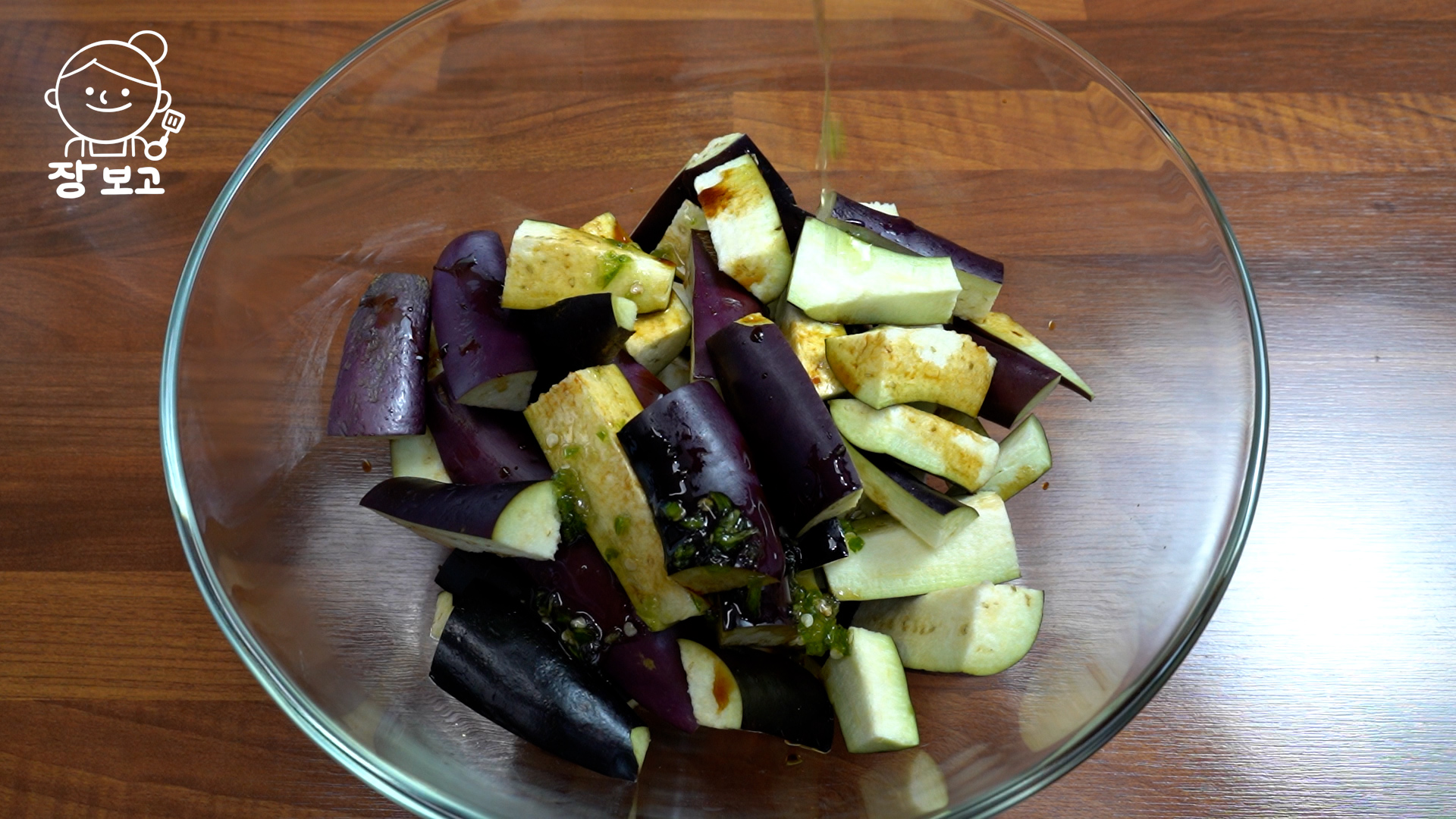 2. 전자레인지 가능 그릇에 썰어 둔 가지와 진간장, 고추청 넣고 무친 뒤 10분간 절인다