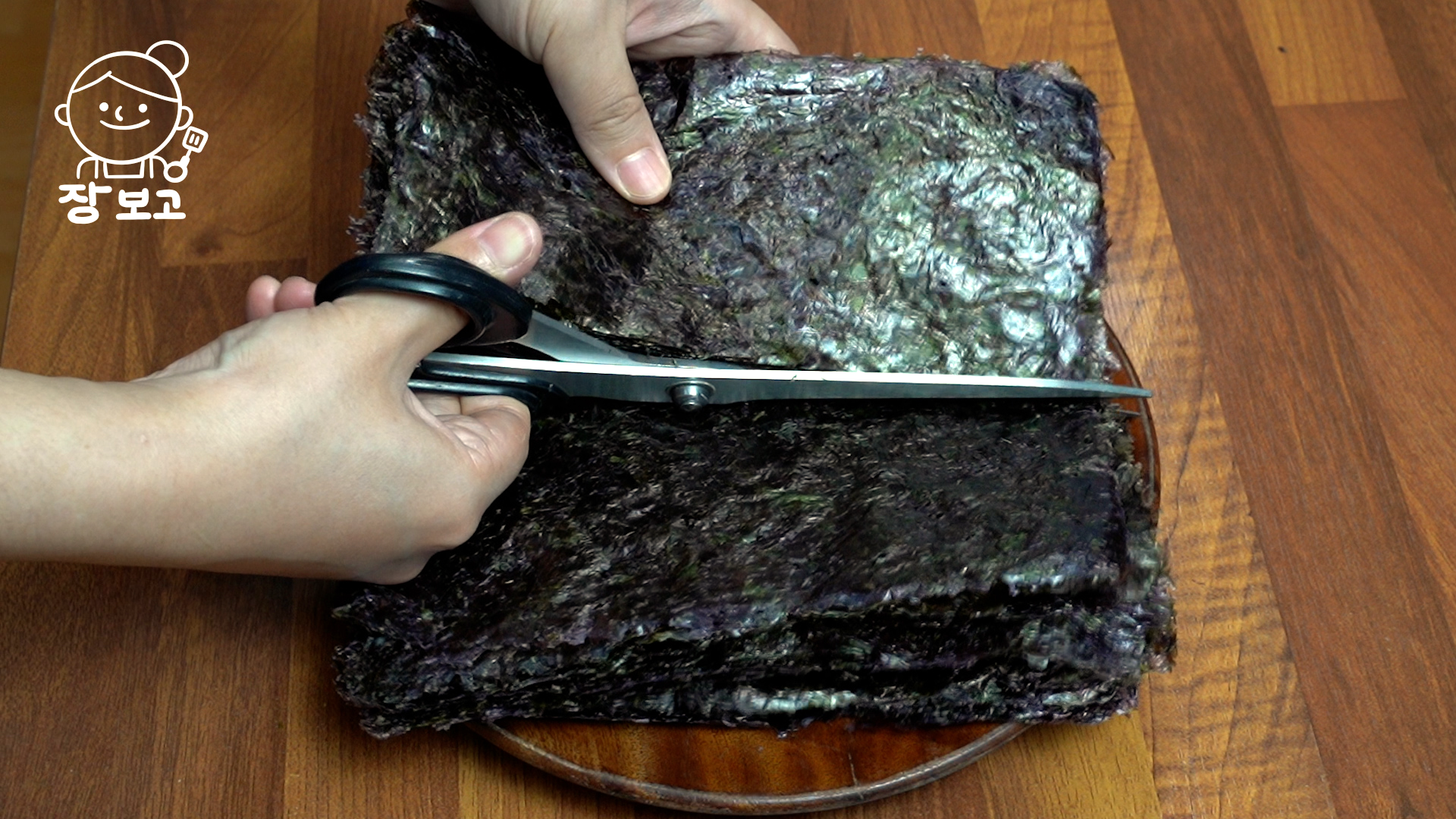 3. 가위로 김을 2등분한다. (김 끝이 엉기니 처음부터 먹기 좋은 사이즈로 자르지 않는다)