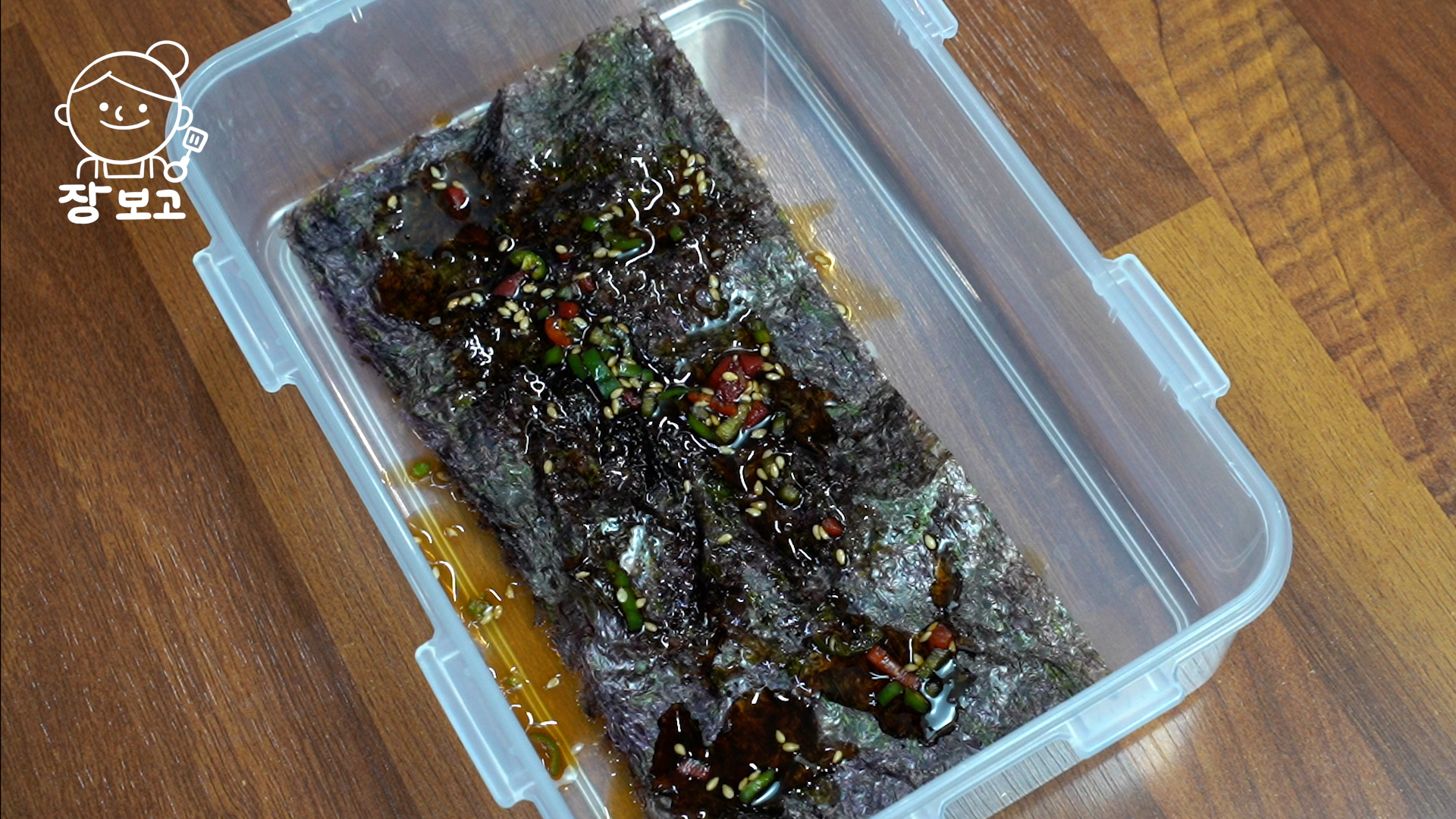 7. 반찬통에 양념 간장 두 큰 술 깔고 김을 두 장씩 깔고 양념장 한 스푼 놓기를 반복하고 맨 위에 양념을 싹 붓는다.