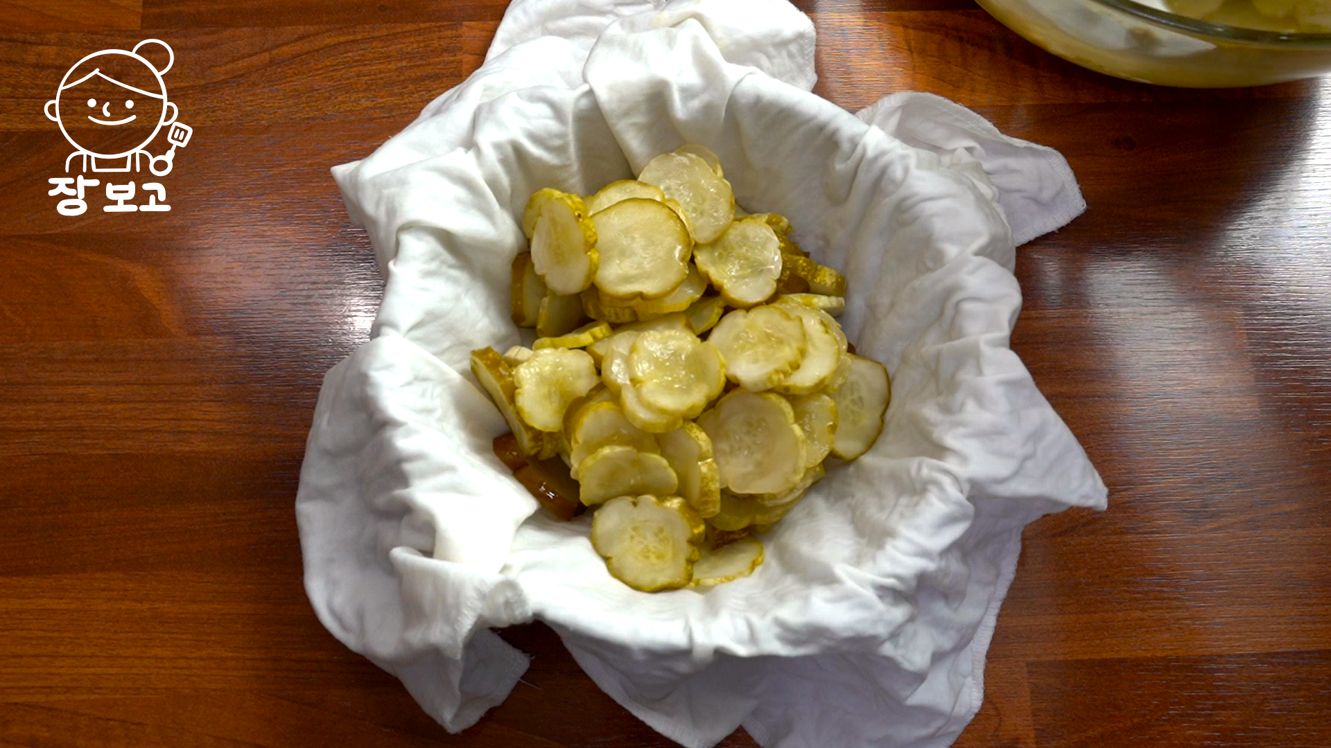 2. 20분 뒤 짠기가 빠지면 면포에 오이지를 넣고 물기를 꼭 짠다. (꼭 짜야 질척이지 않는다)