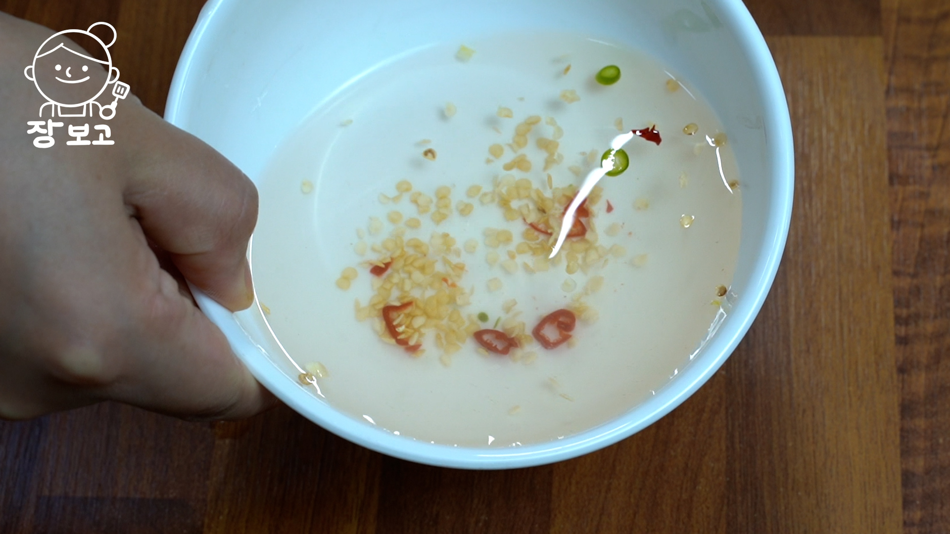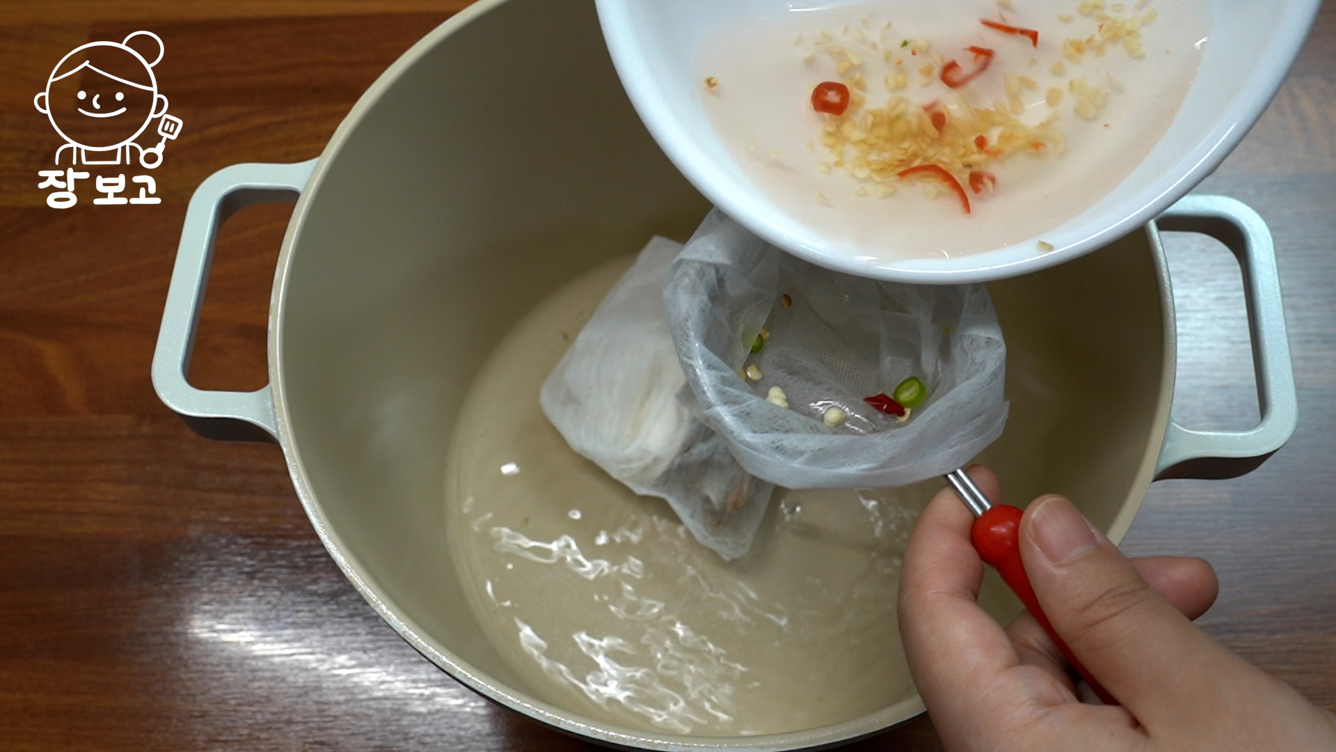 칼칼하게 먹을 거라면 다른 다시 백에 청양고추씨 물을 부어 고추씨백을 만들어 준다.