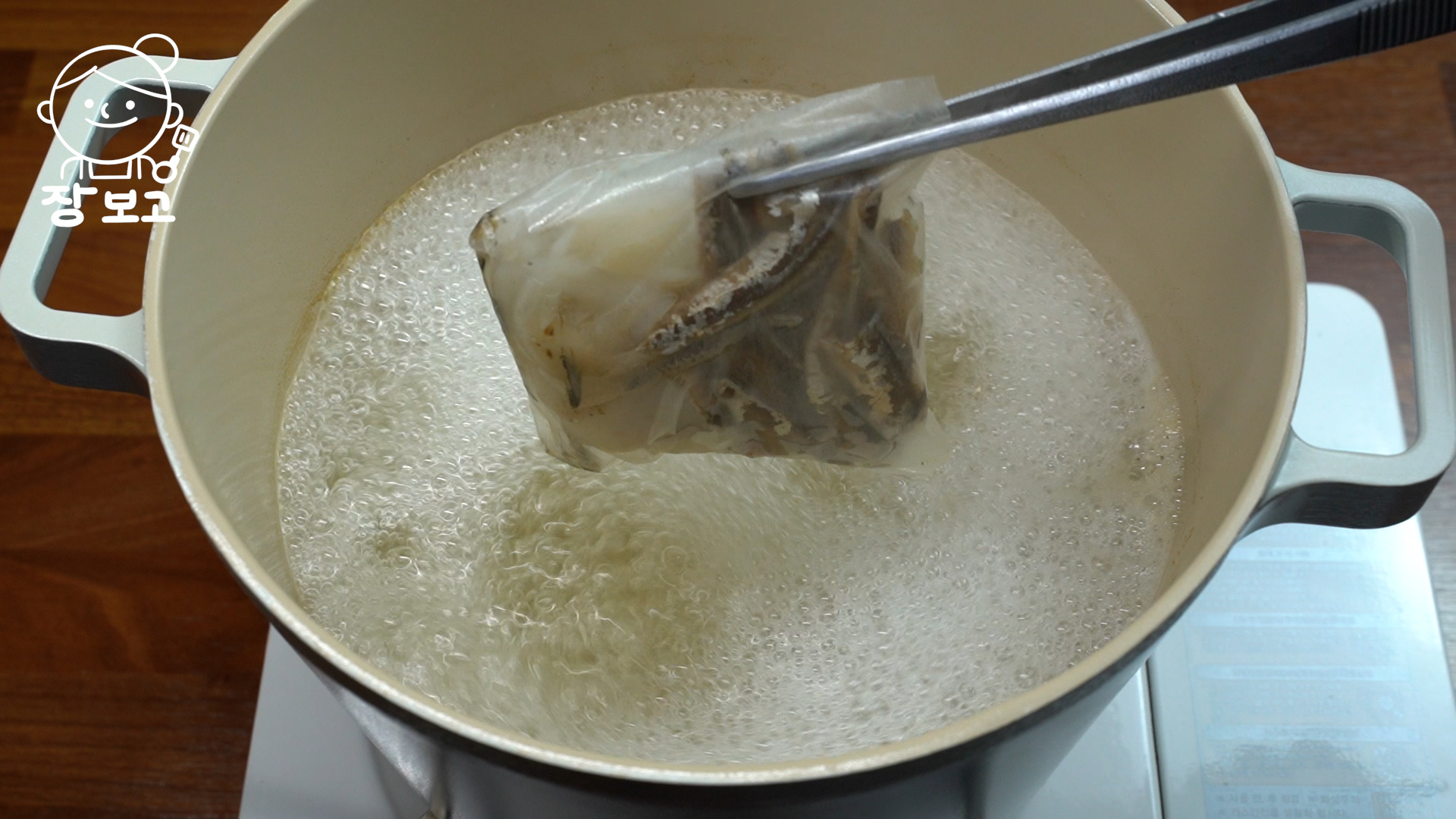 4. 냄비에 물 2L와 채썬무 넣고 중 강불로 끓인다. 끓는 시점에서 10분간 더 끓인 뒤 다시백을 건져낸다.