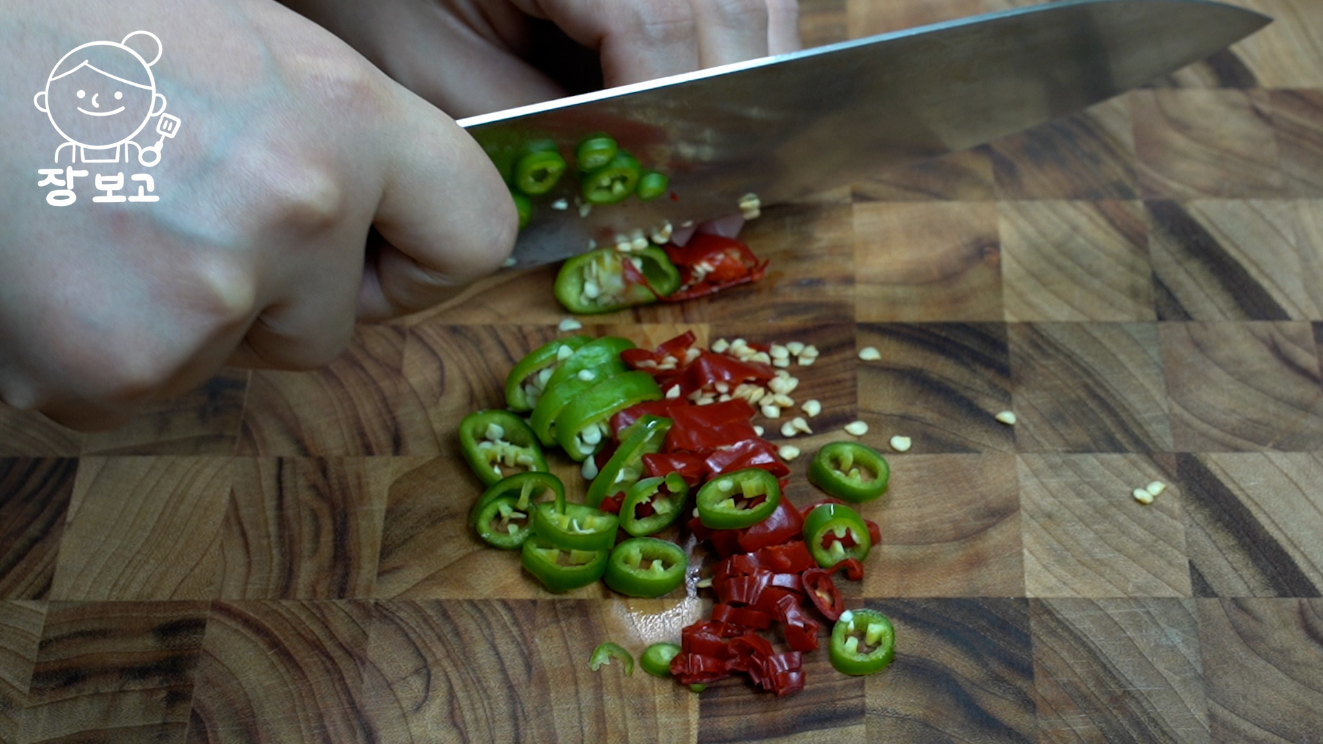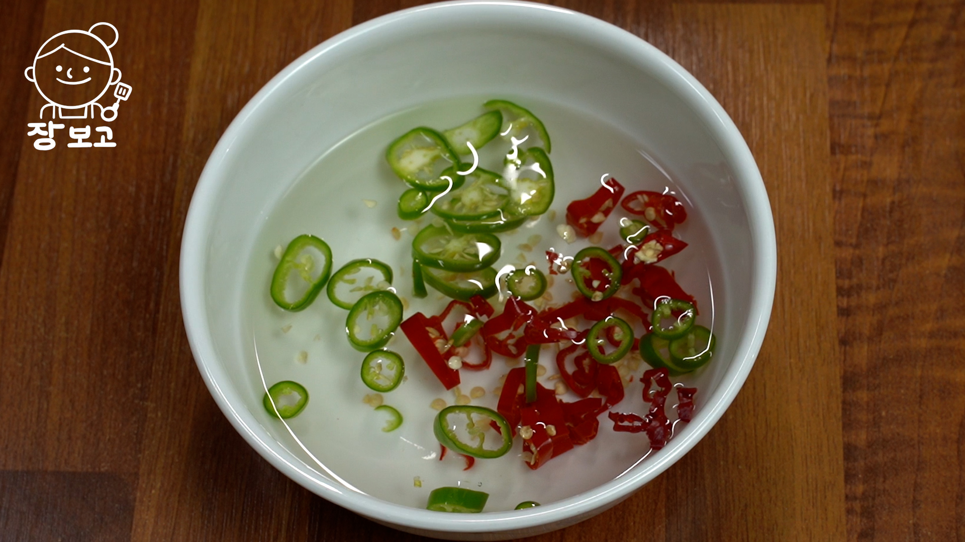 청양고추와 홍고추는 얇게 썰어 물그릇에 넣어 흔들면 깔끔하게 씨가 빠진다. (칼칼하게 먹을 거라면 고추씨 물은 버리지 않는다)
