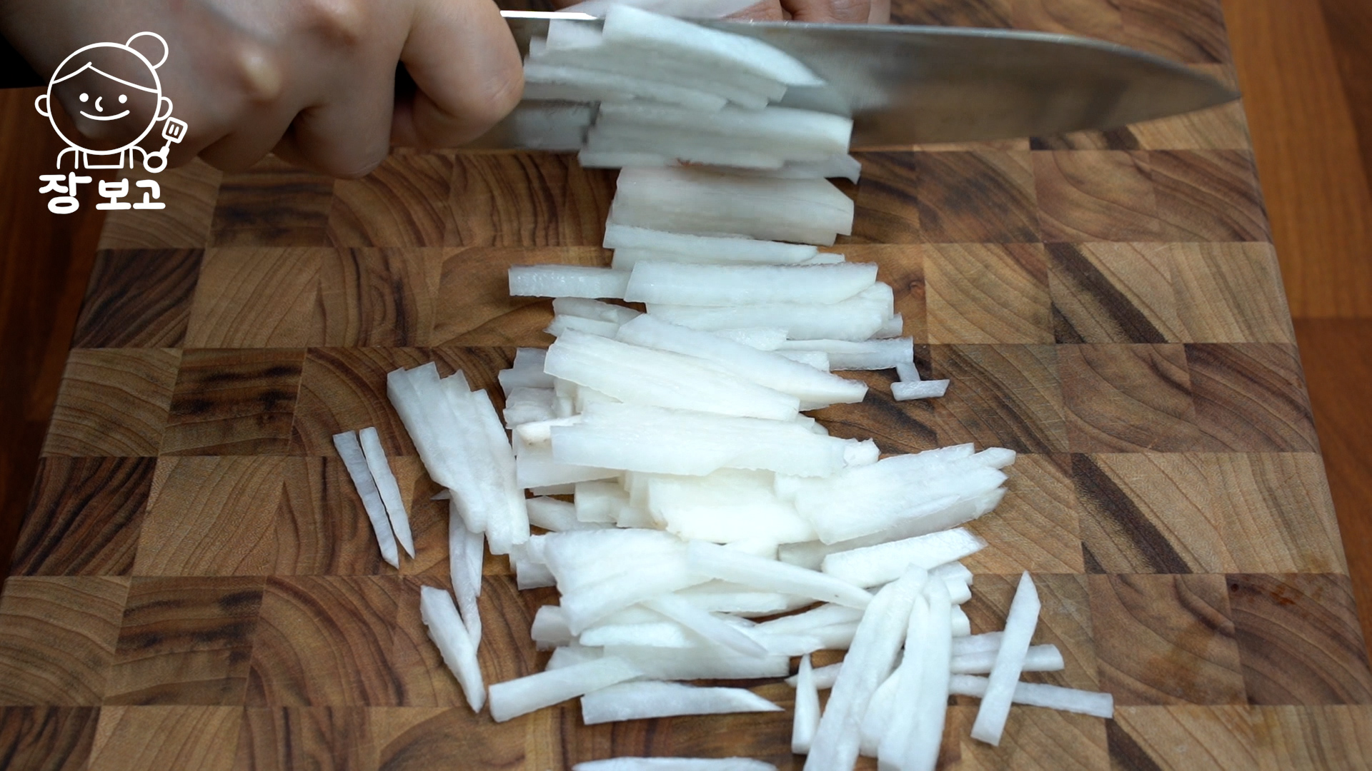 2. 깨끗이 씻은 무는 껍질을 벗기고 세로로 길게 채썬다. (무 껍질은 버리지 않는다)