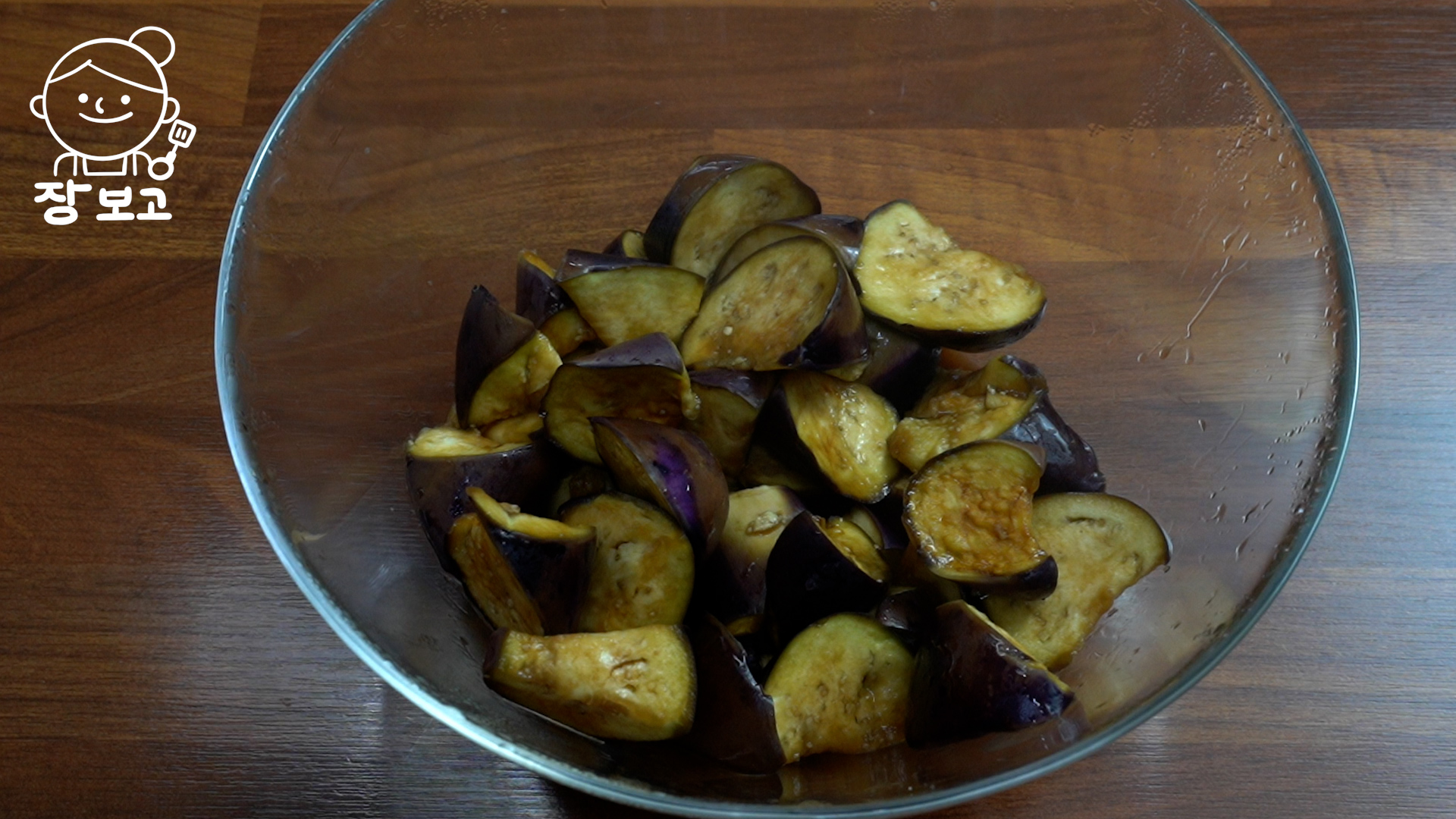 1. 가지는 양 끝을 날리고 삼각 모양으로 도톰하게 썬다. 진간장 3큰술을 넣고 버무린 뒤 전자레인지용 그릇에 담아 랩 씌우고 4분 돌린다.