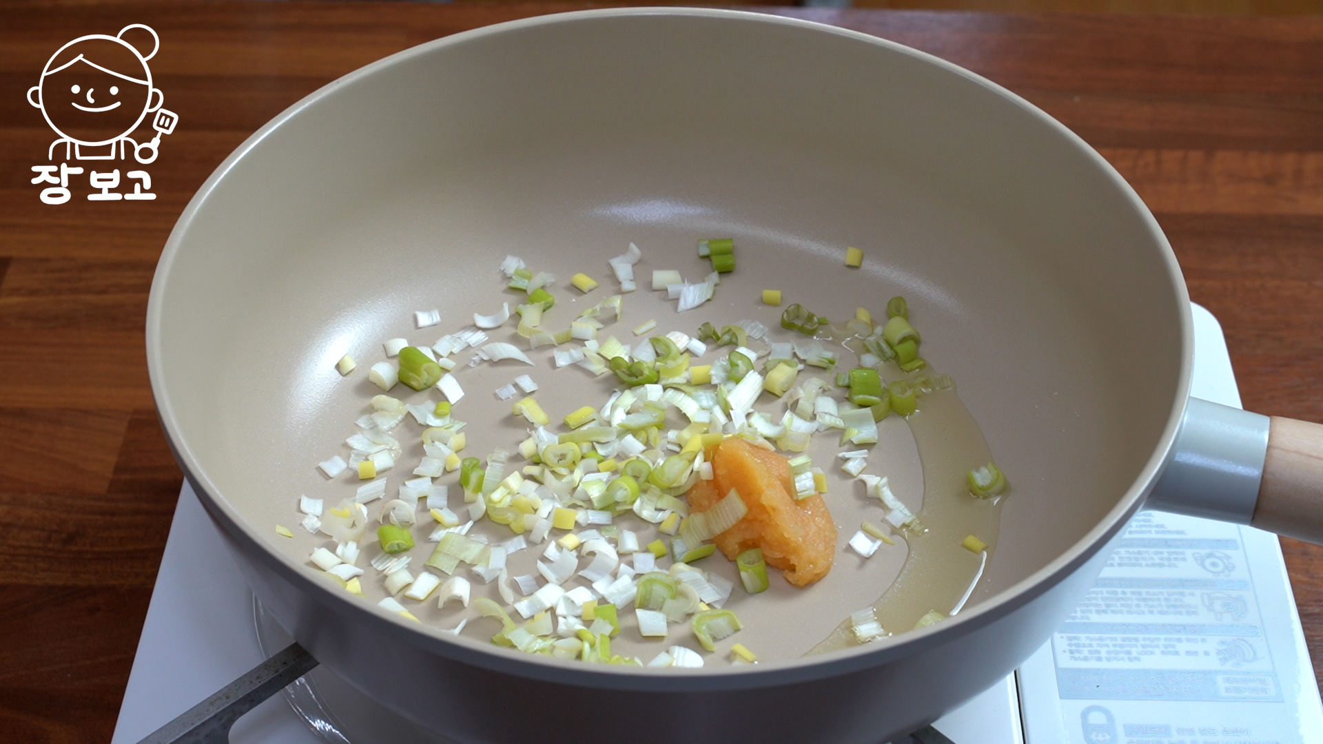 3. 프라이팬에 식용유 2큰술을 두르고 중불에 다진 마늘 1큰술과 다진 대파를 넣고 볶는다.