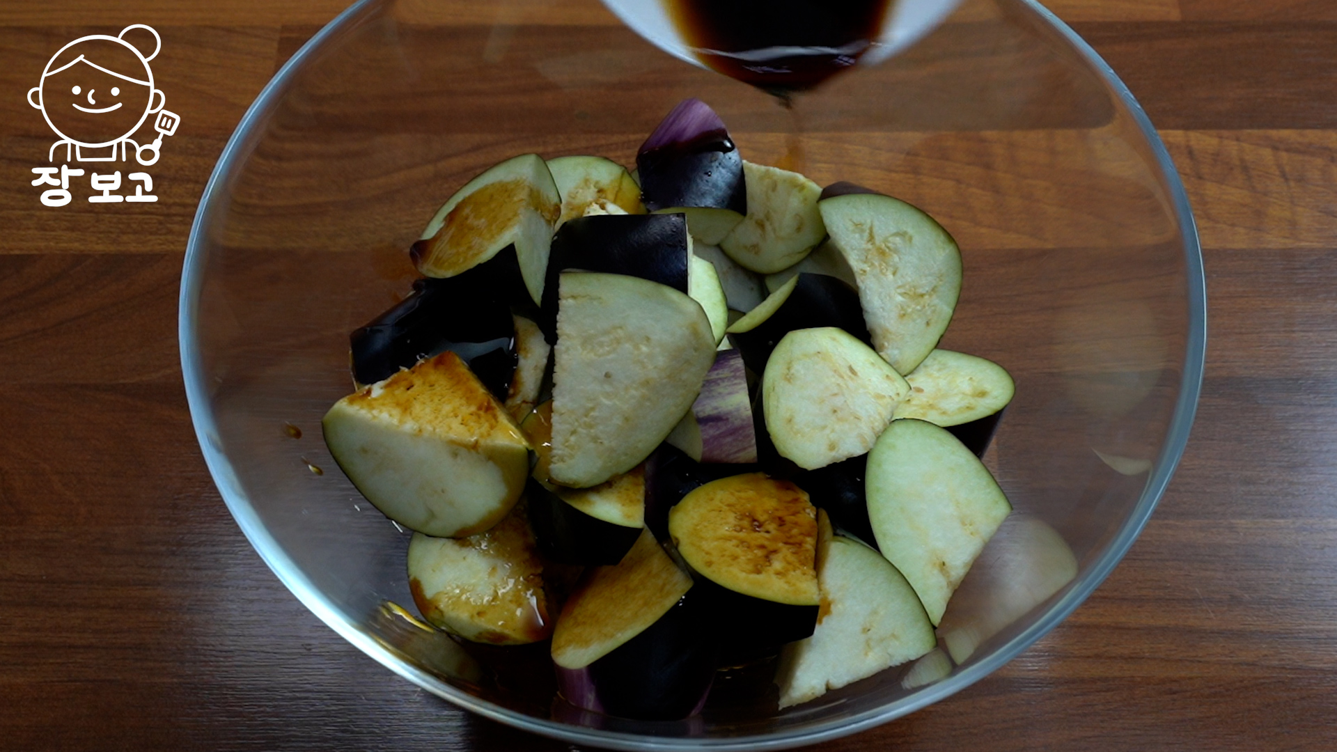 1. 가지는 양 끝을 날리고 삼각 모양으로 도톰하게 썬다. 진간장 3큰술을 넣고 버무린 뒤 전자레인지용 그릇에 담아 랩 씌우고 4분 돌린다.