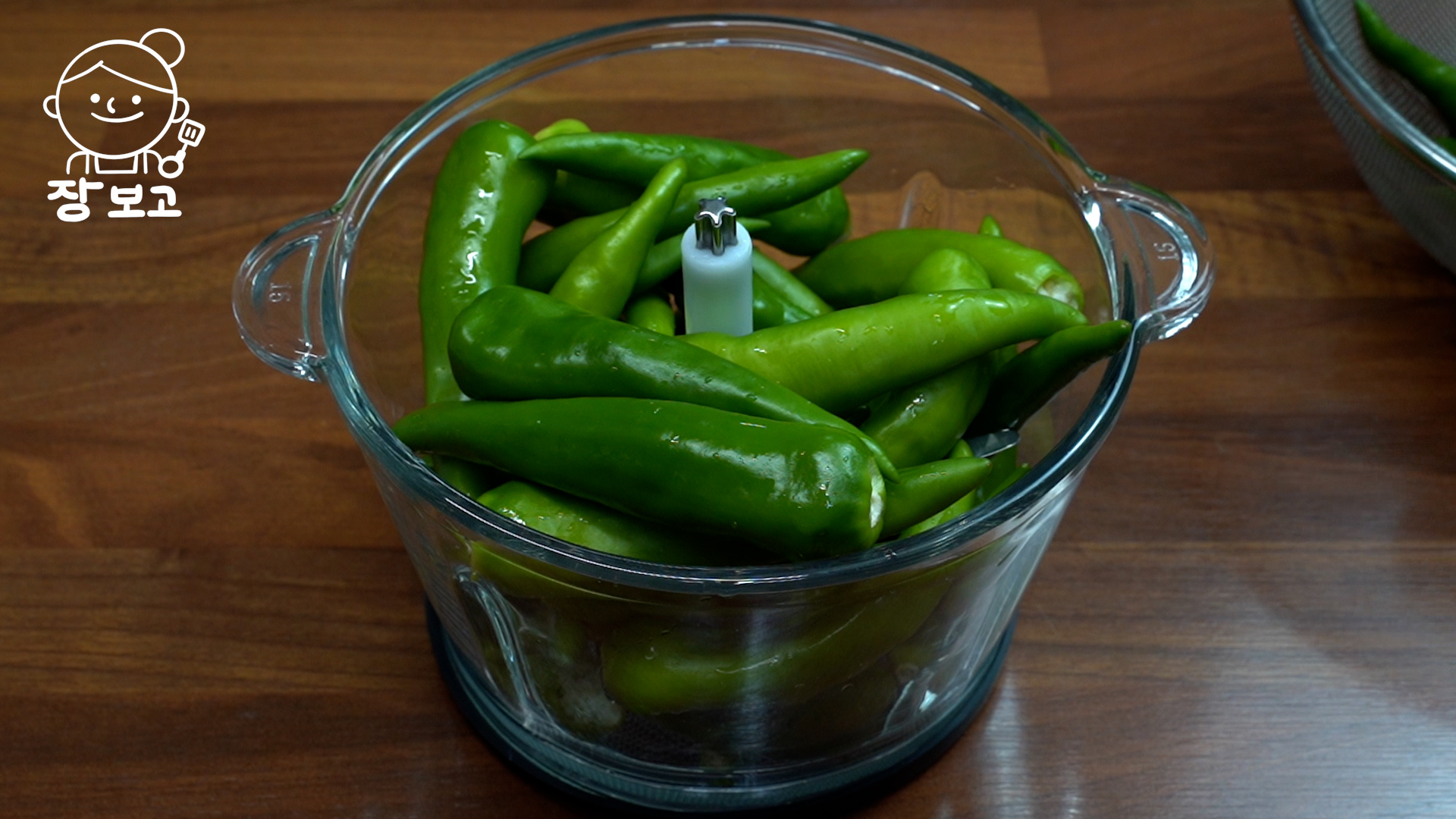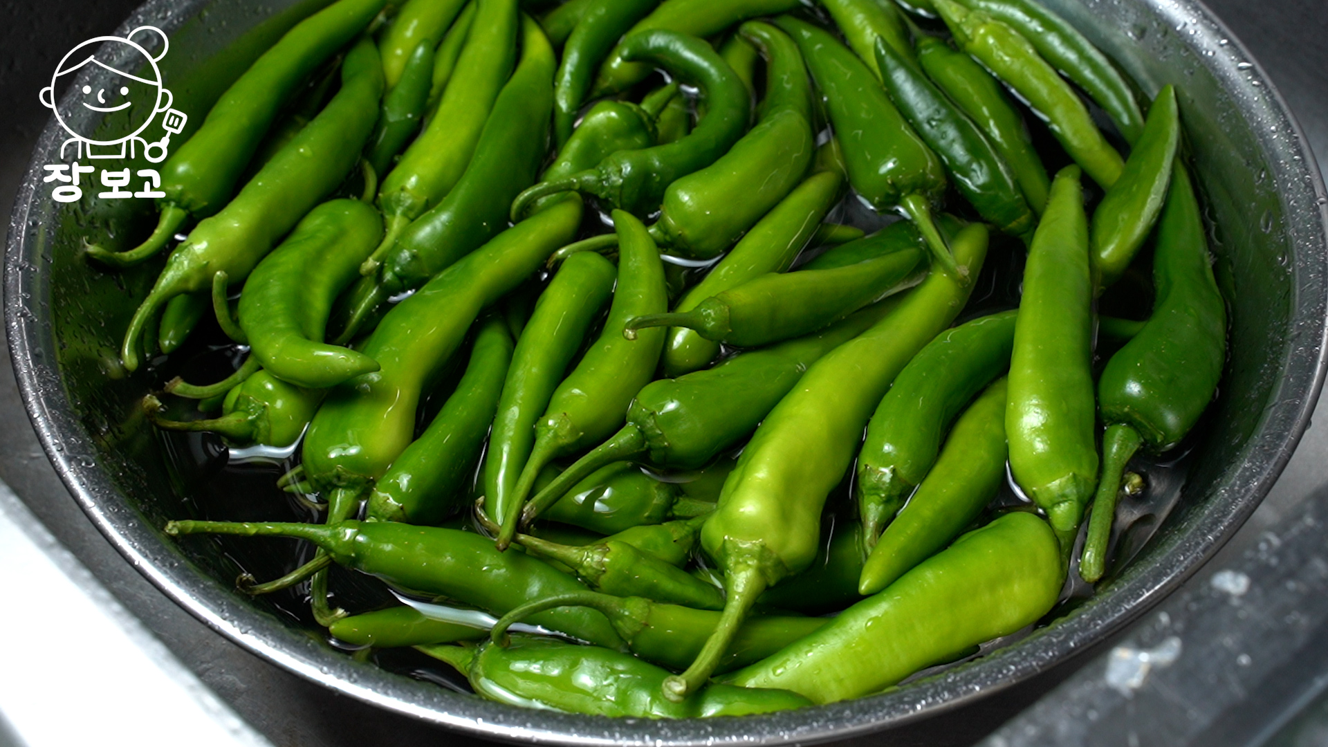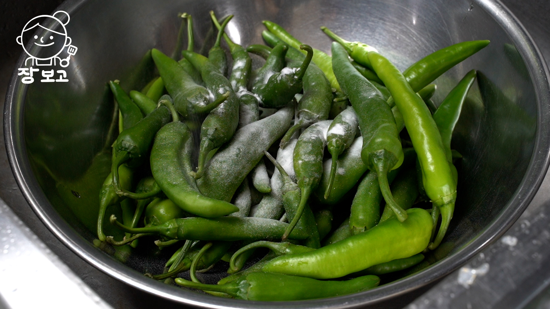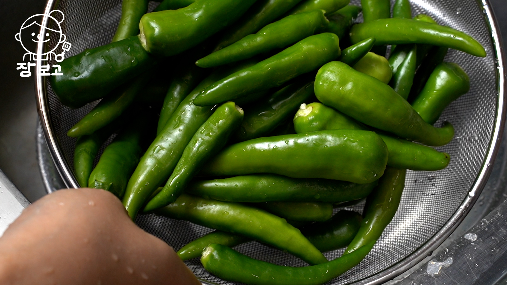 1. 안 매운 고추 300g, 청양고추 300g을 준비한다. 매운걸 못 먹으면 전부 안 매운 고추로 하거나, 매운걸 잘 먹으면 전부 청양고추로 해도 좋다. 고추는 베이킹소다 1큰술 넣고 물에 10분간 담가서 불순물을 제거한다. 꼭지를 떼고 깨끗이 헹궈서 채반에 받쳐 물기 뺀다.