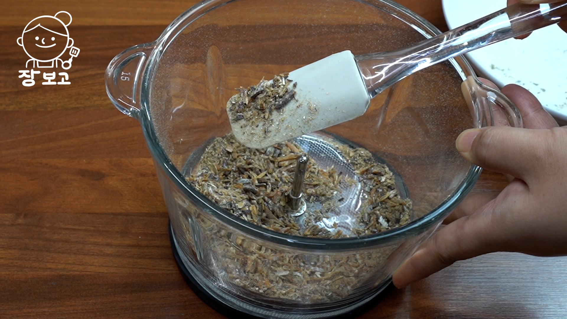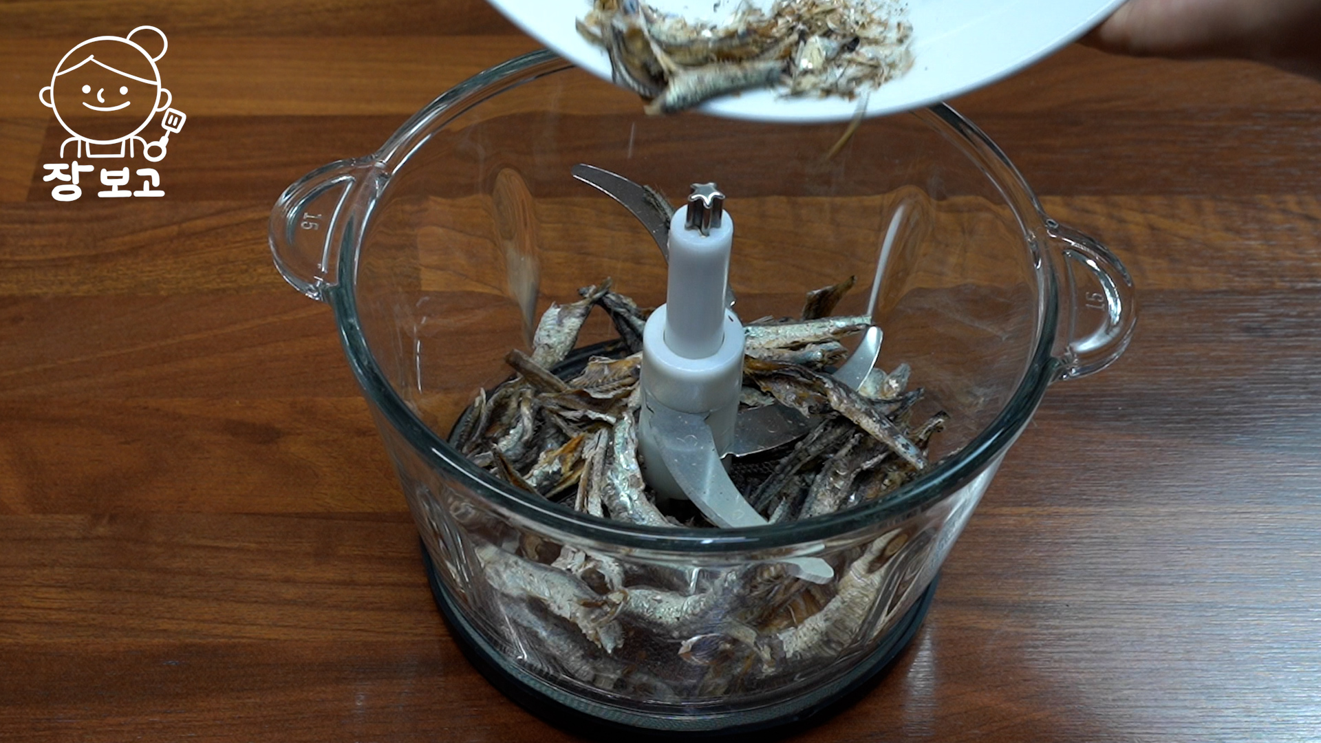 3. 바삭해진 멸치는 전동 다지기에 넣어 입자 있게 갈아준다. 입자가 큰 멸치는 쫄깃한 고기 식감이며, 입자가 작은 멸치가루는 감칠맛을 극대화한다. 칼로 다진다면 반은 굵게, 반은 곱게 다지는 것이 좋다.