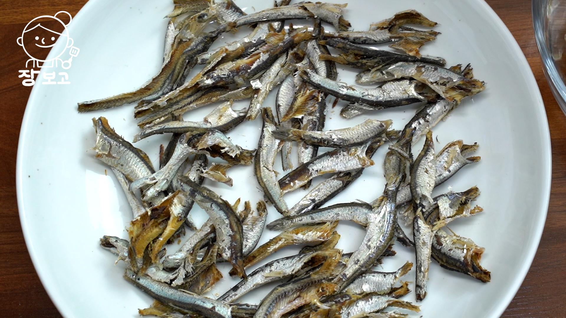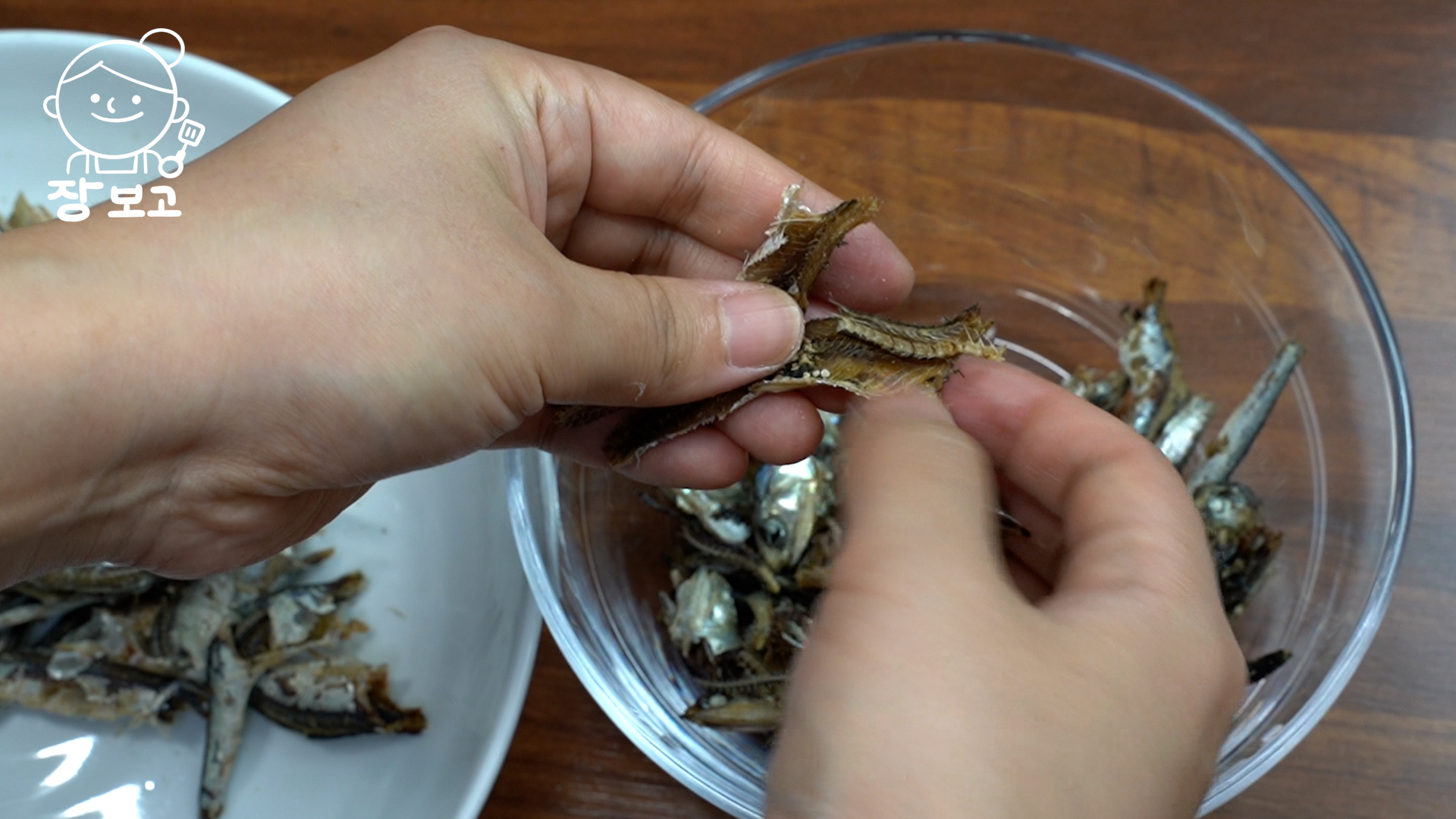 2. 국물용 멸치 100g은 쓴맛 나는 머리와 내장을 떼고 전자레인지 가능 접시에 넓게 펼쳐서 2분간 돌린다. 마른 팬에 볶는 것보다 전체적으로 노릇하고 바삭하게 수분이 날아간다. (작은 멸치보다 큰 멸치를 사용해야 식감과 감칠맛이 좋다)