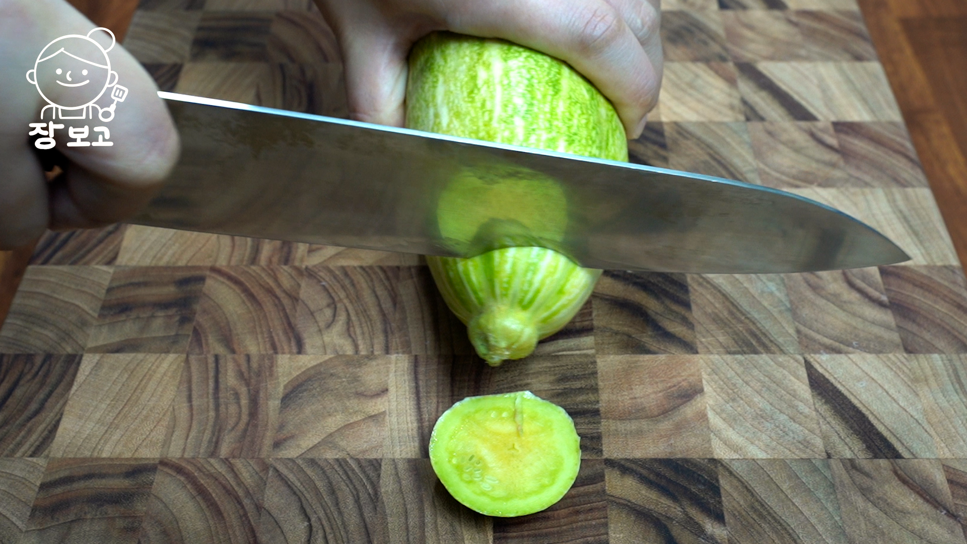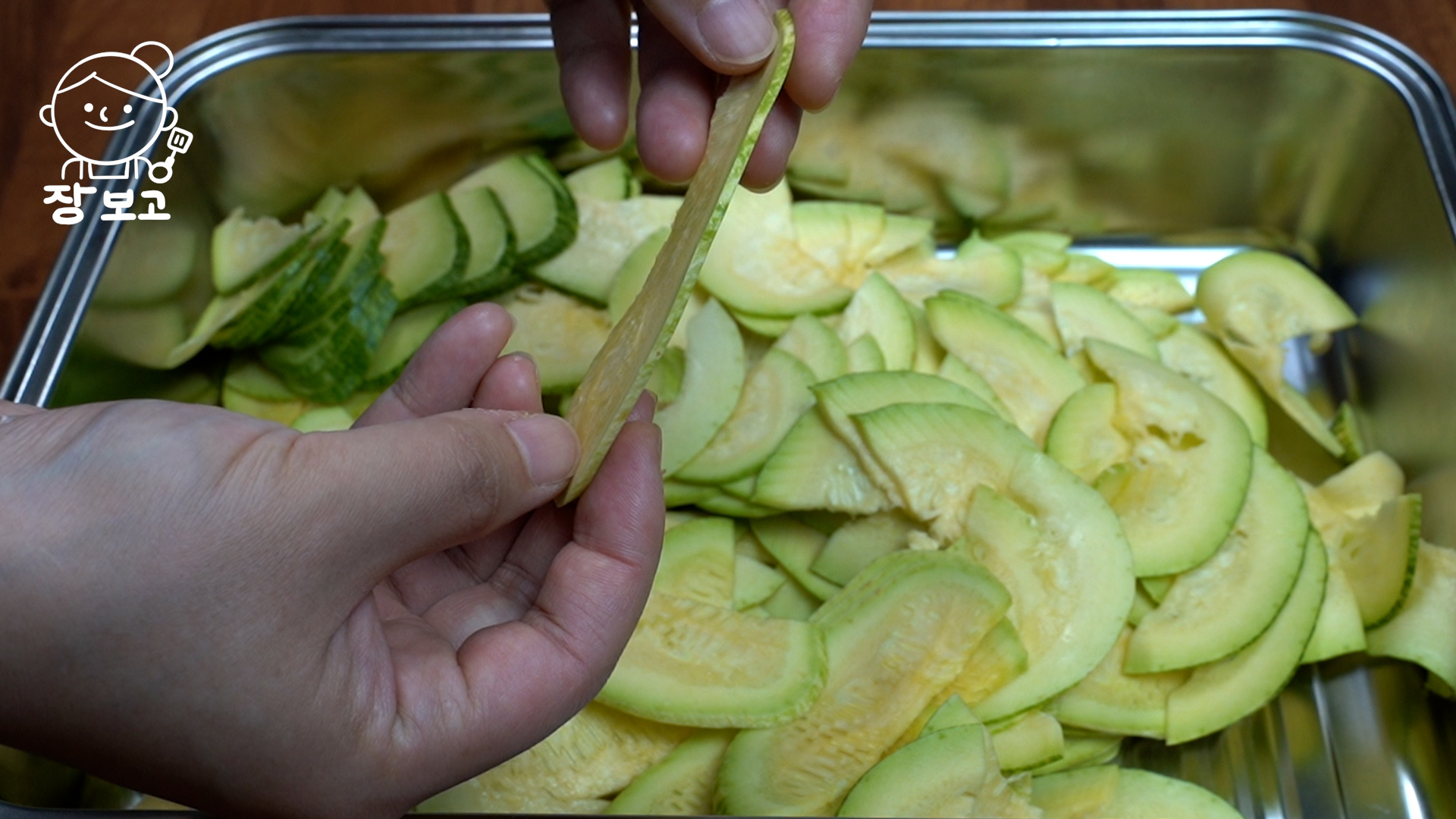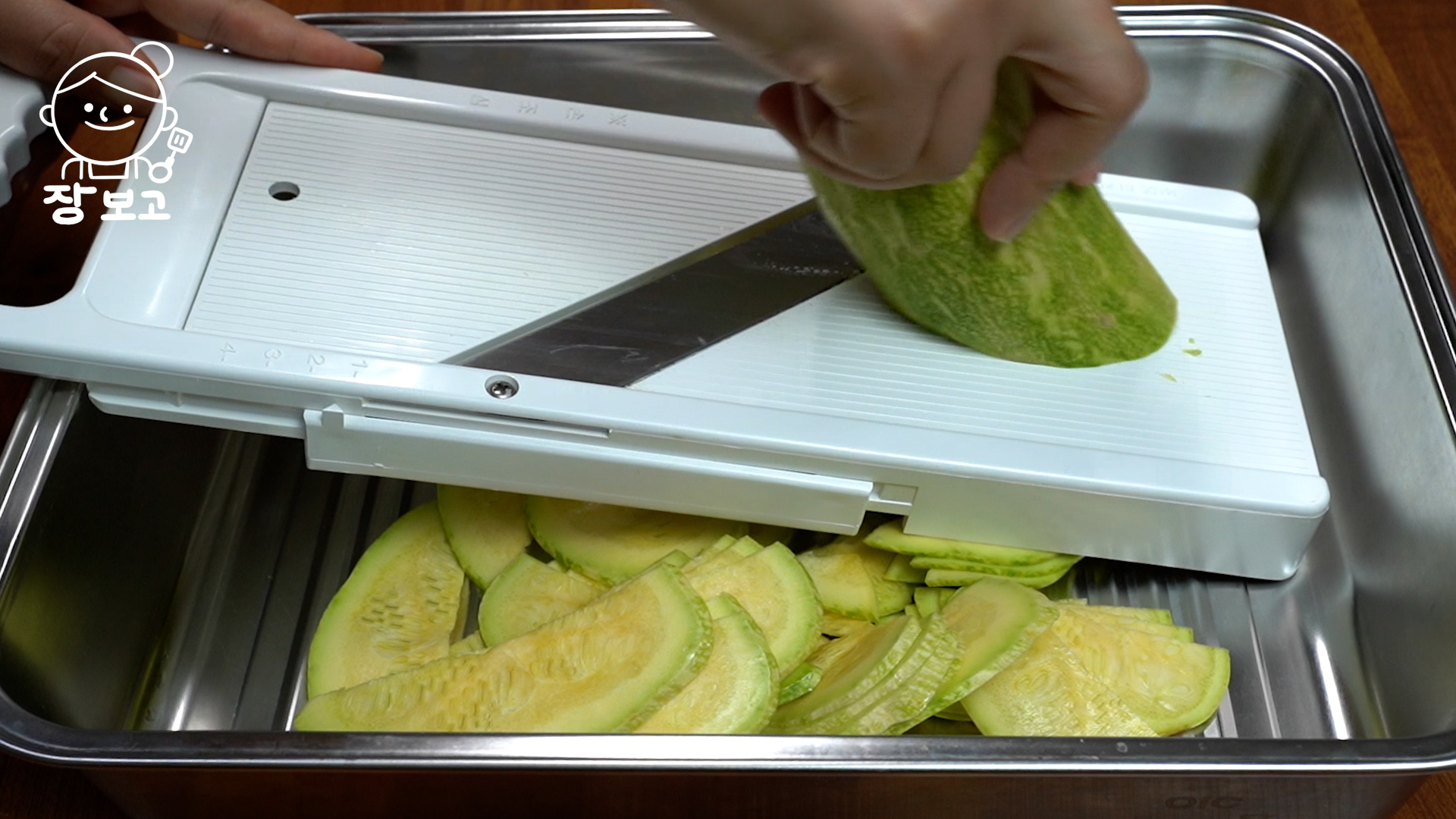1. 애호박 2개는 양 끝을 날리고 길게 2등분 한 뒤 최대한 얇게 슬라이스 한다. 양배추 슬라이서를 사용하면 편하다.