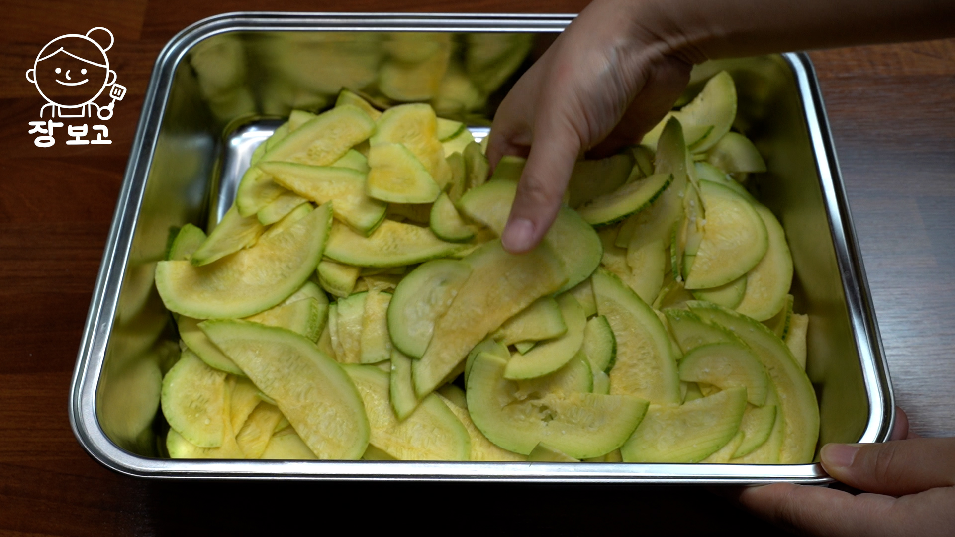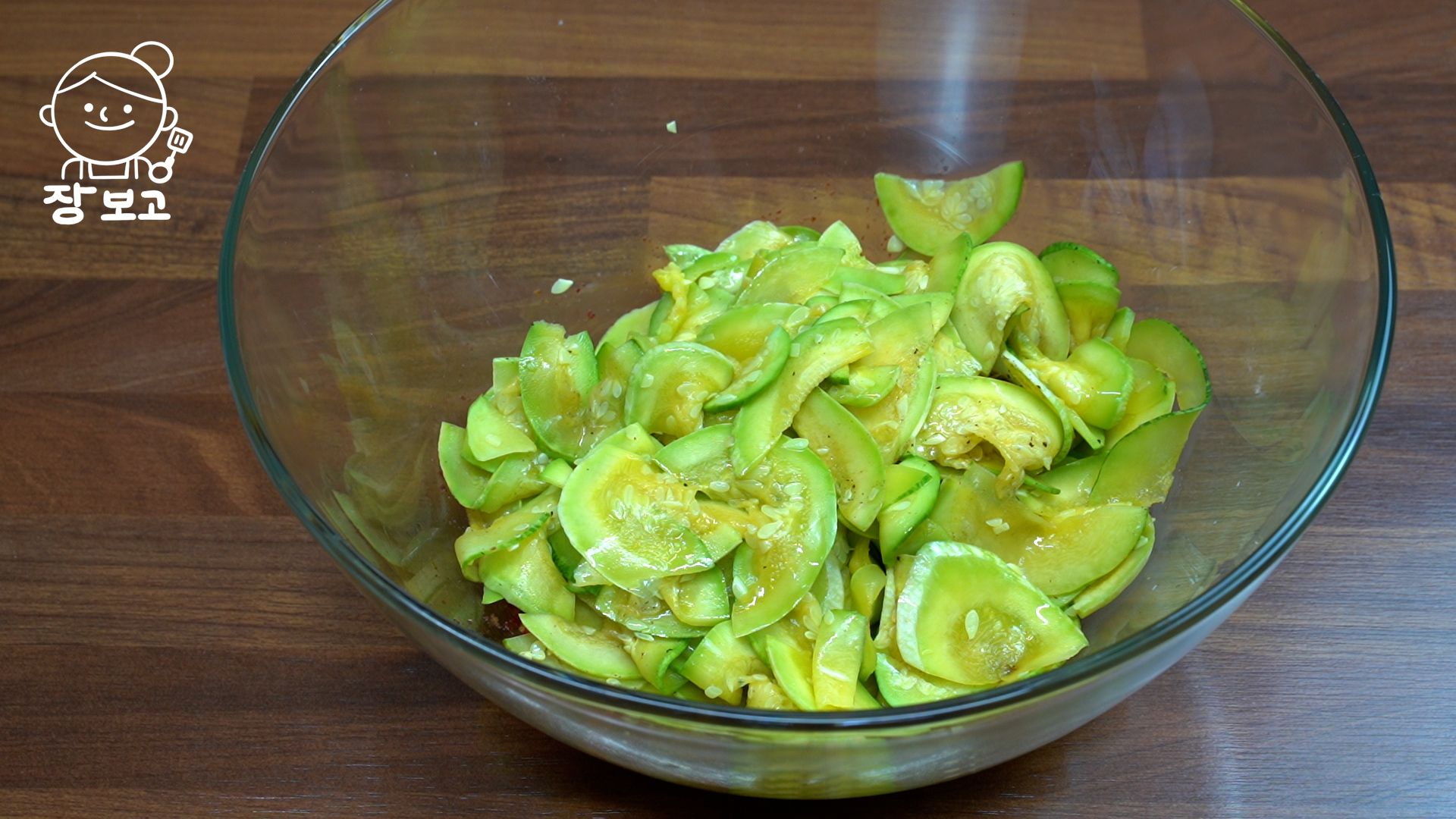 2. 슬라이스 한 애호박에 소금 1작은술 넣고 5분만 절인다. 이 과정을 거치면 애호박이 고구마처럼 달아진다.