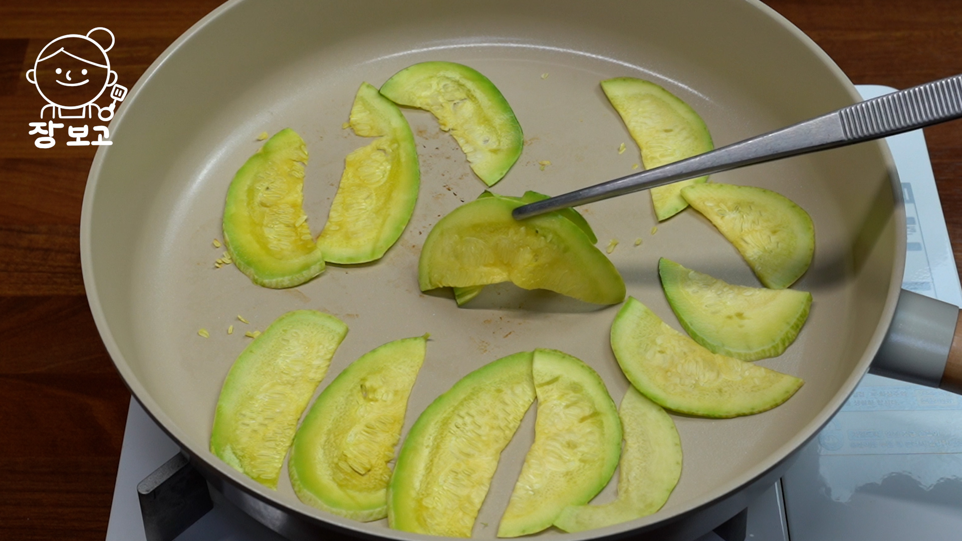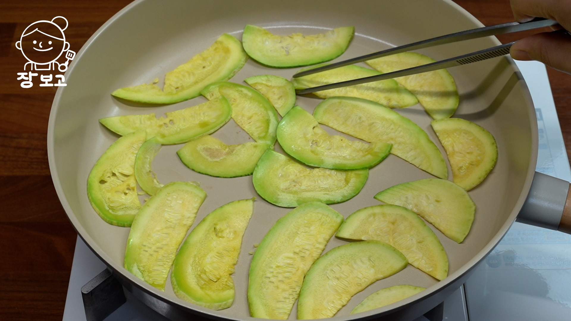 5. 마른팬에 애호박을 깔고 약불에서 끝이 투명해지면 뒤집어서 바로 빼준다. 잔열로도 충분히 익는다.