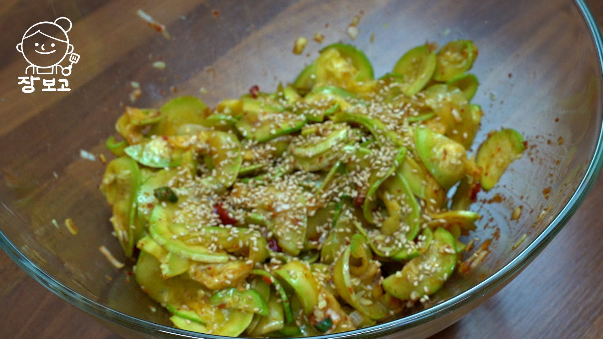 7. 잘 구워진 애호박은 양념장에 넣고 살살 무친다. 통깨 솔솔 뿌린다. 참기름을 넣지 않아도 충분히 맛있다.