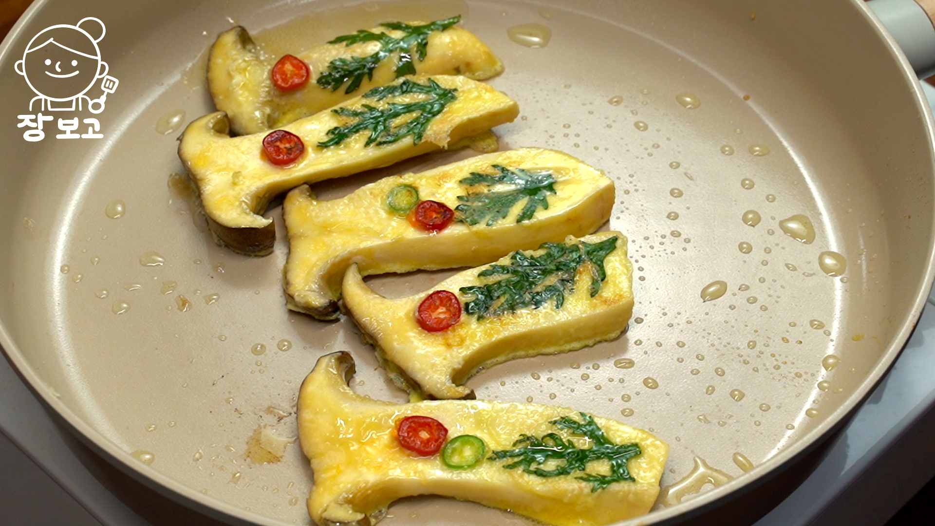 7. 팬에 식용유 넉넉히 두르고 중약불에 계란물 묻힌 버섯을 올린다.