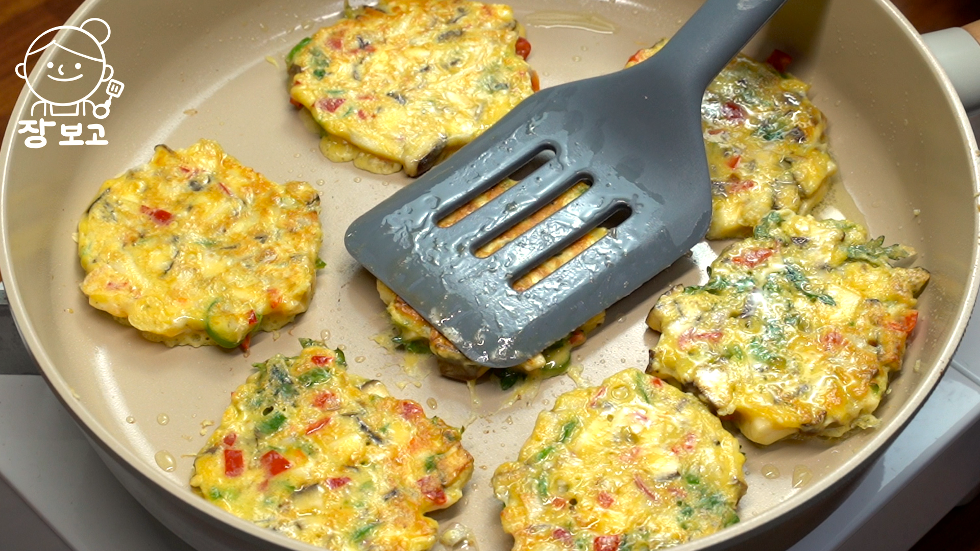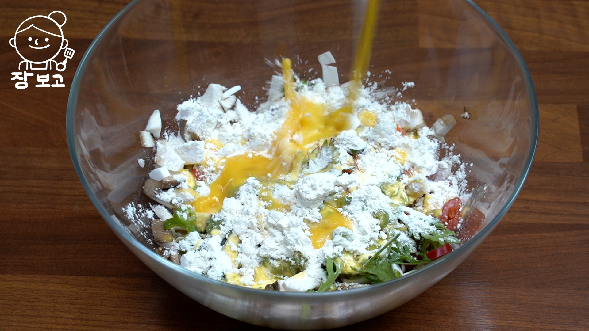 새송이버섯, 쑥갓, 청홍고추, 당근, 대파, 부침가루, 계란, 포도씨유