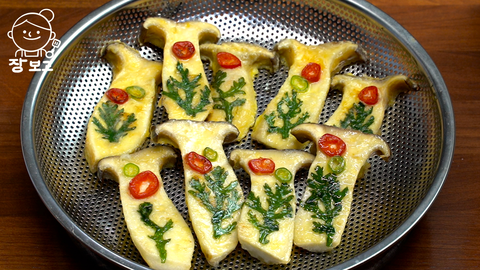 명절에 버섯하나로 이렇게 전 부쳐보세요. 너무 예쁘고 고급스럽다고 집안 어르신들께 칭찬 많이 받습니다~^^ 가족들에게 박수 받는 인기 많은 새송이 버섯 전! 만들어 보겠습니다.