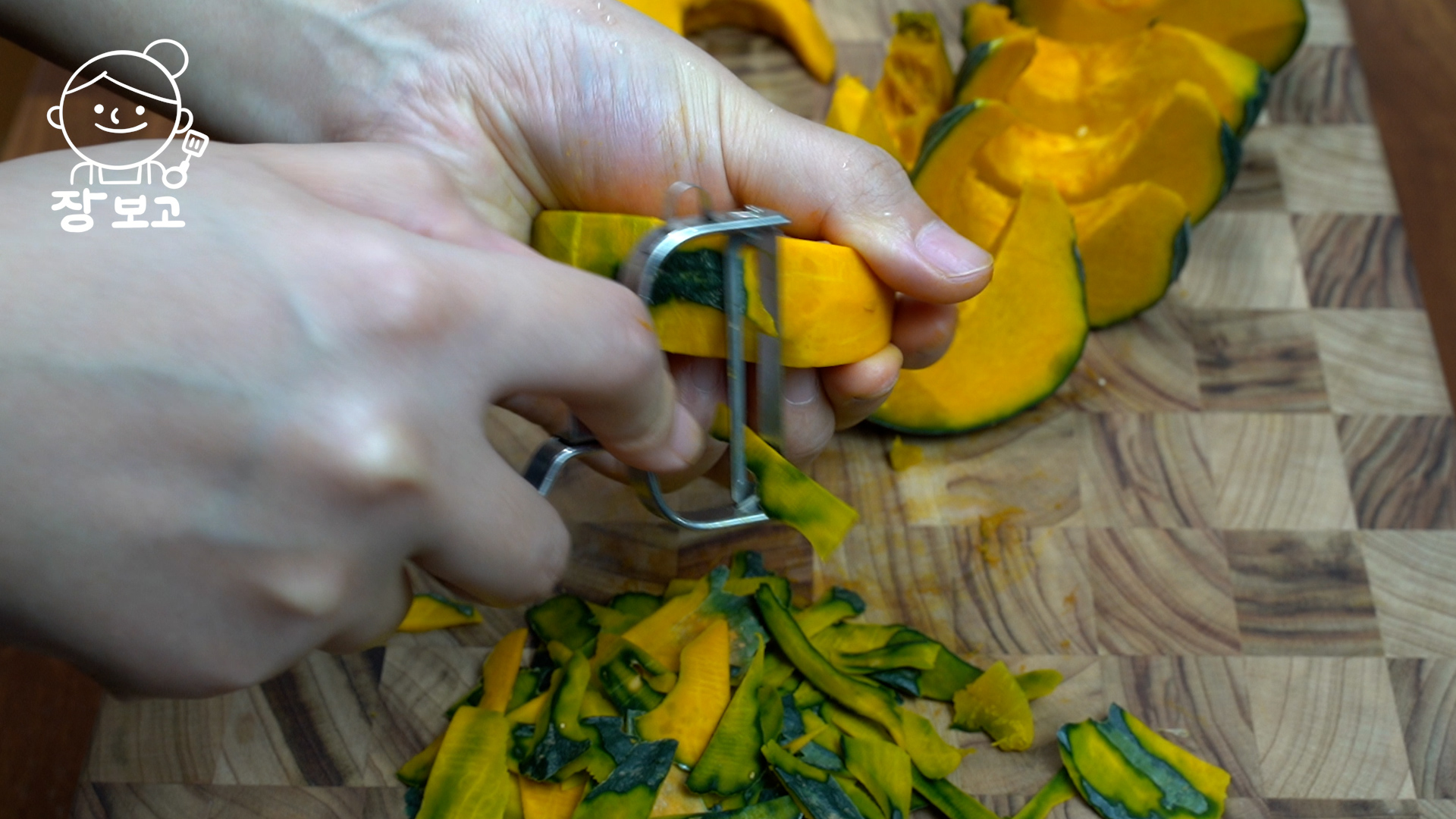 5. 전자레인지에 2분 돌린 단호박은 반으로 썰어 속을 파고 껍질을 벗긴다.
