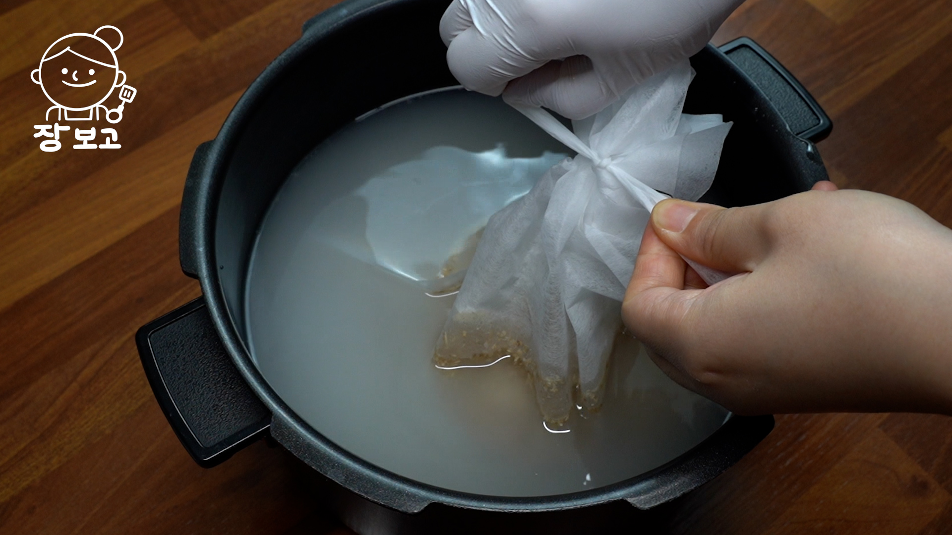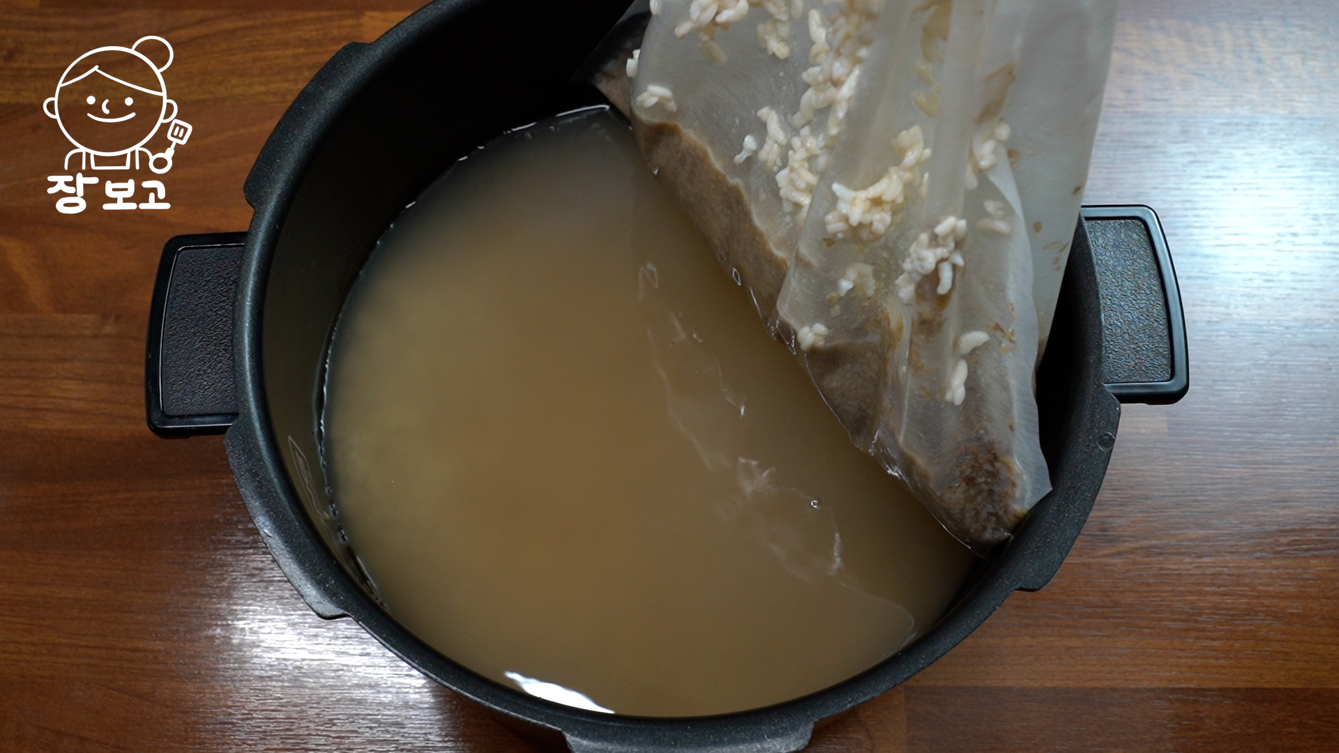 3. 국물팩에 엿기름 200g 넣고 잘 묶어 밥 아래 조심히 깔아준다.