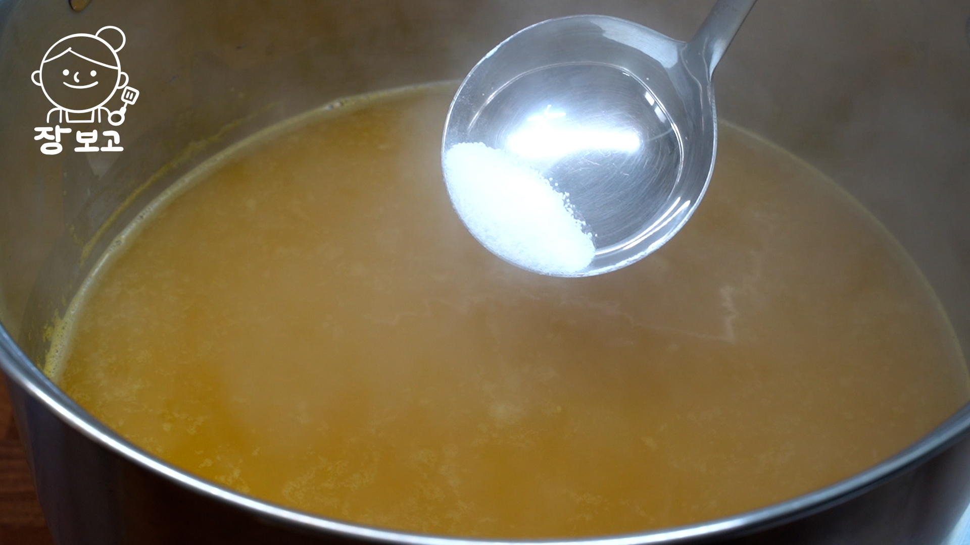 9. 큰 솥에 단호박 물, 식혜 물, 밥알 헹군 물을 넣고 끓는 시점에서 10분간 팔팔 끓인다.