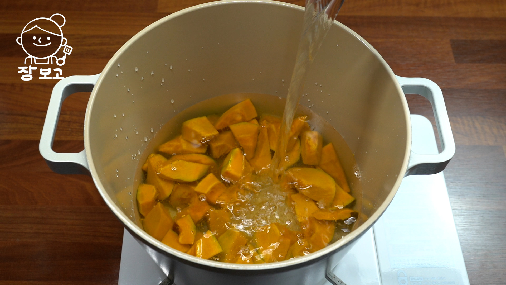 6. 깍둑 썰어 냄비에 담고 물 1L를 부어 단호박을 익힌 뒤 도깨비방망이로 곱게 갈아준다. (소금을 조금 넣으면 감칠맛이 있고, 단 맛을 올릴 수 있다)