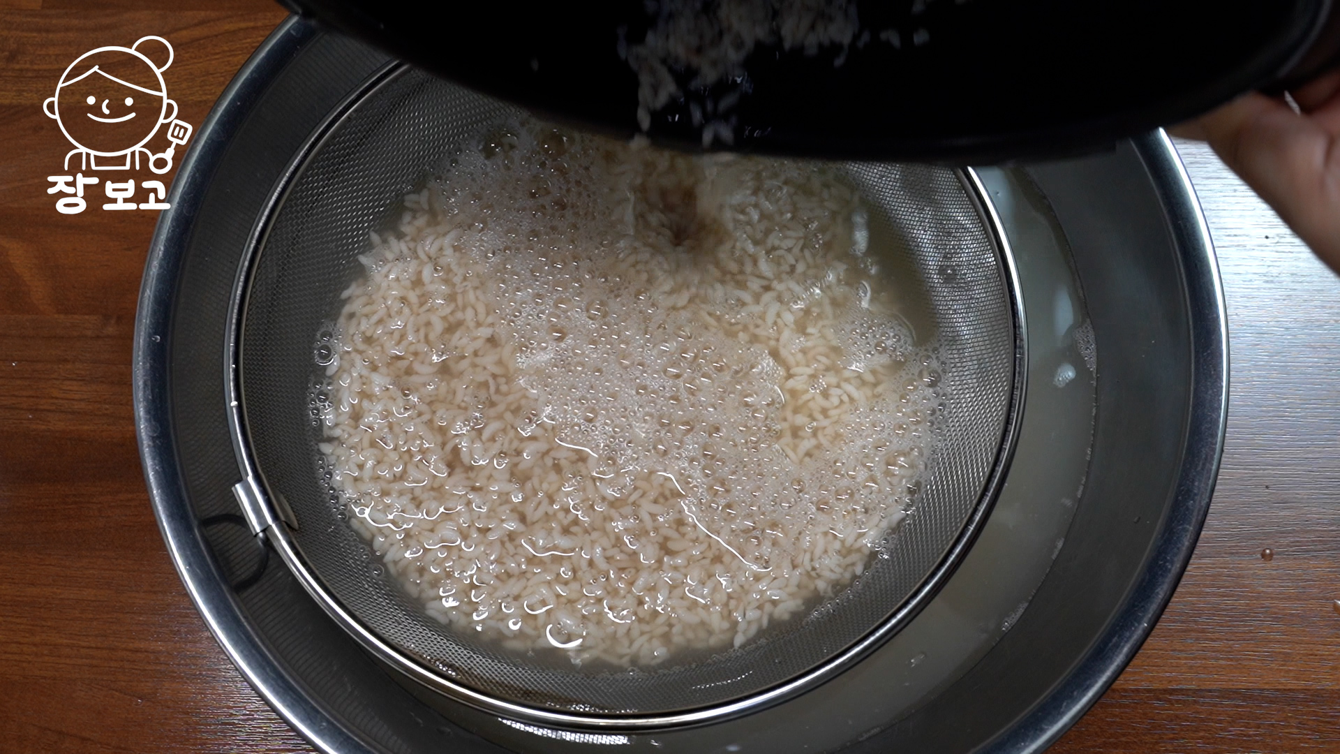 8. 엿기름 팩을 조심히 드러내 버리고, 밥알을 채에 걸러 물에 헹군 뒤 밀폐용기에 담아 냉장고에 넣는다. (밥알의 전분기를 씻어주면 나중에 식혜 먹을 때 밥알이 동동 예쁘게 뜬다)