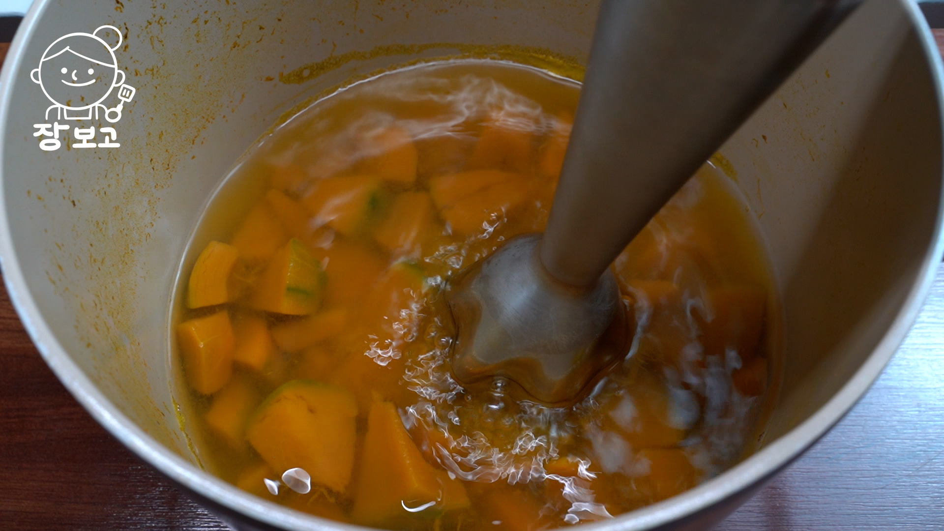 6. 깍둑 썰어 냄비에 담고 물 1L를 부어 단호박을 익힌 뒤 도깨비방망이로 곱게 갈아준다. (소금을 조금 넣으면 감칠맛이 있고, 단 맛을 올릴 수 있다)