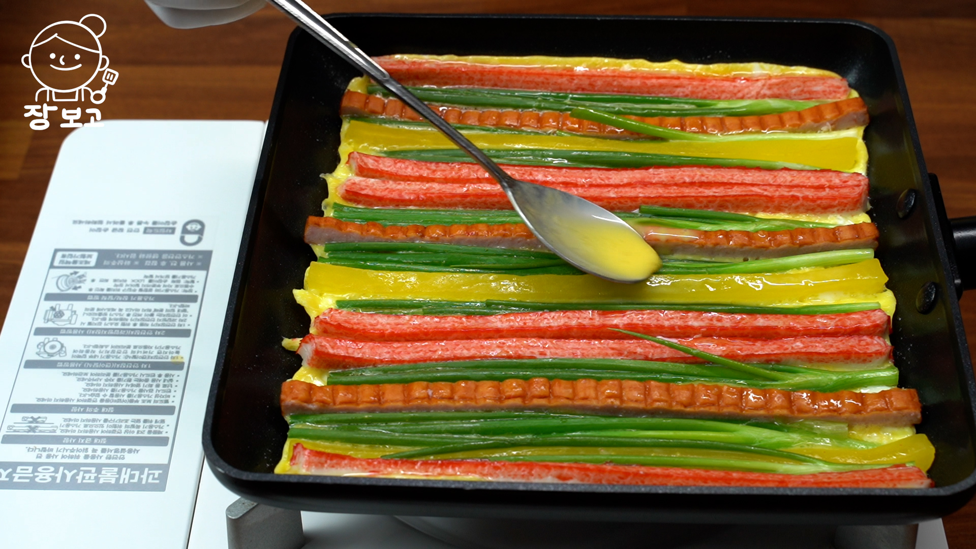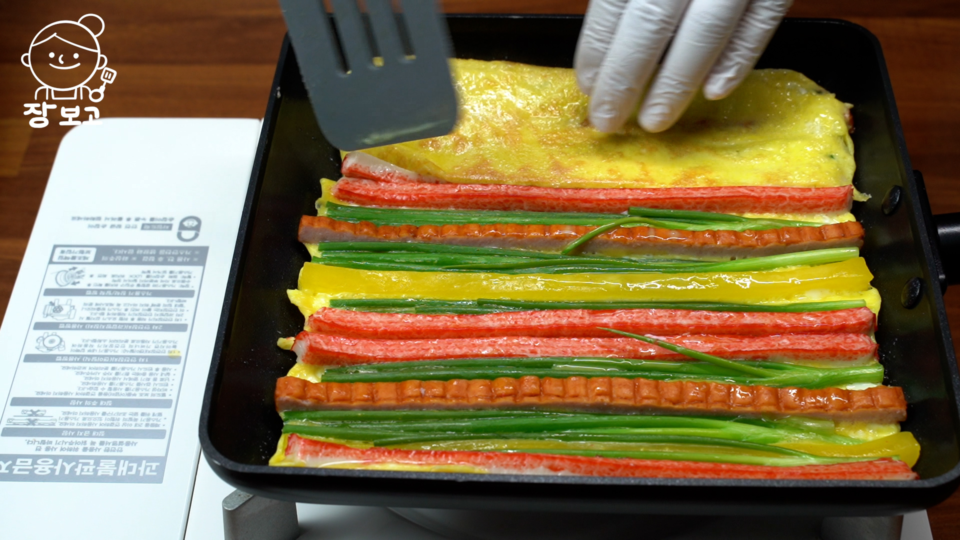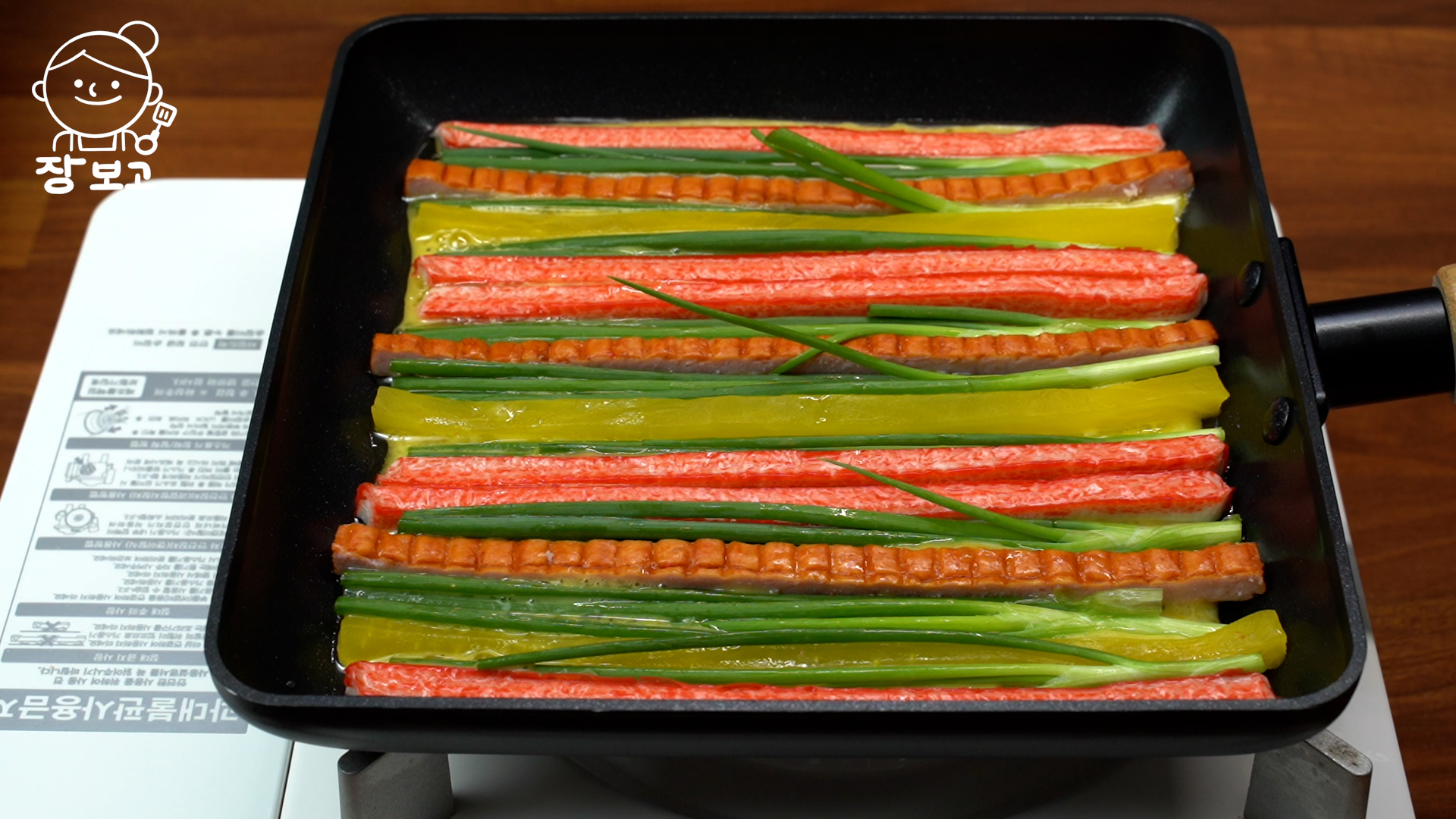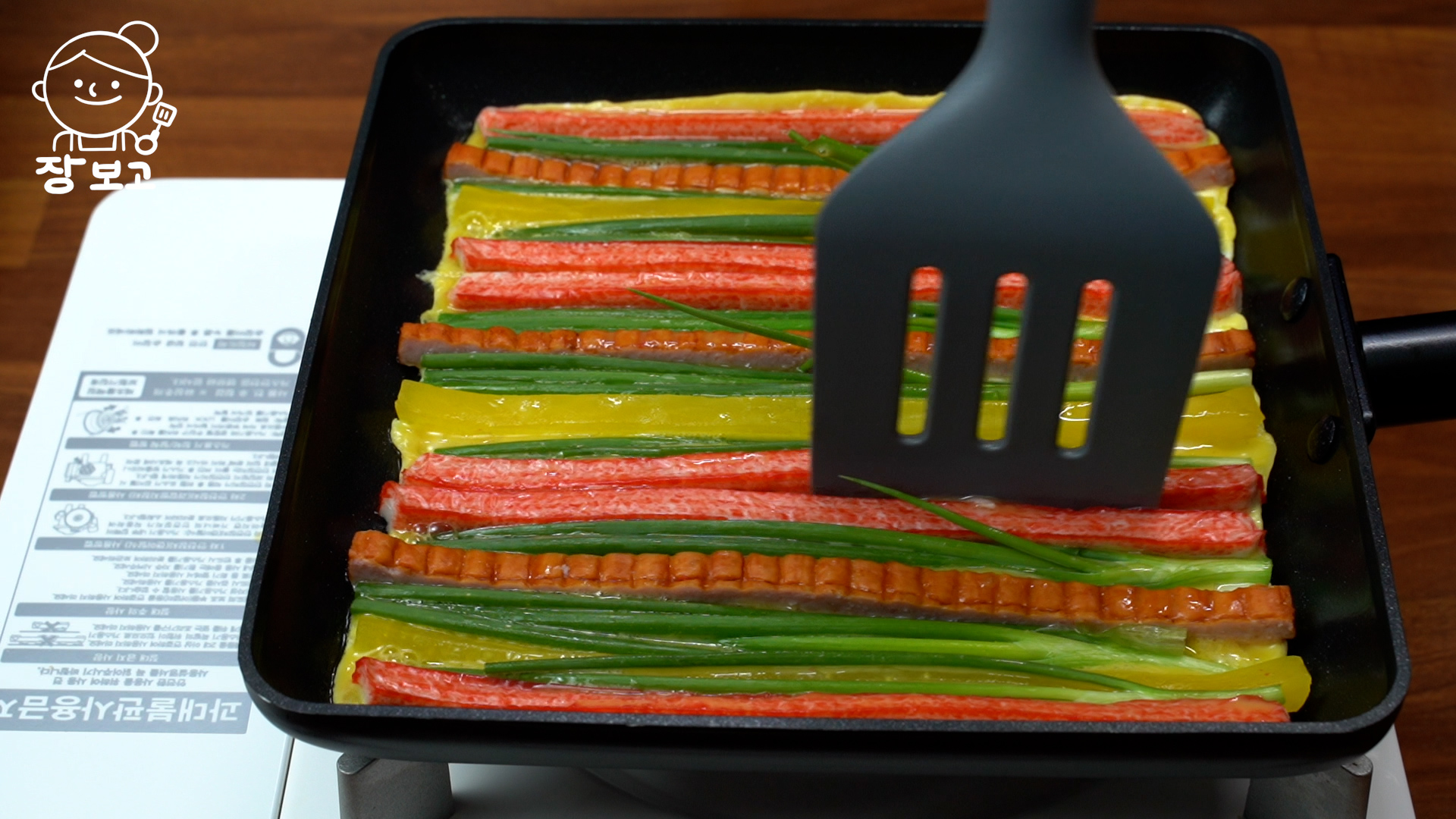 3. 약불에 팬 올리고 기름 두르고 계란물을 붓고 재료를 올린다. 맛살->쪽파->햄->쪽파->단무지->쪽파->맛살 순으로 올리면 색이 예쁘다.