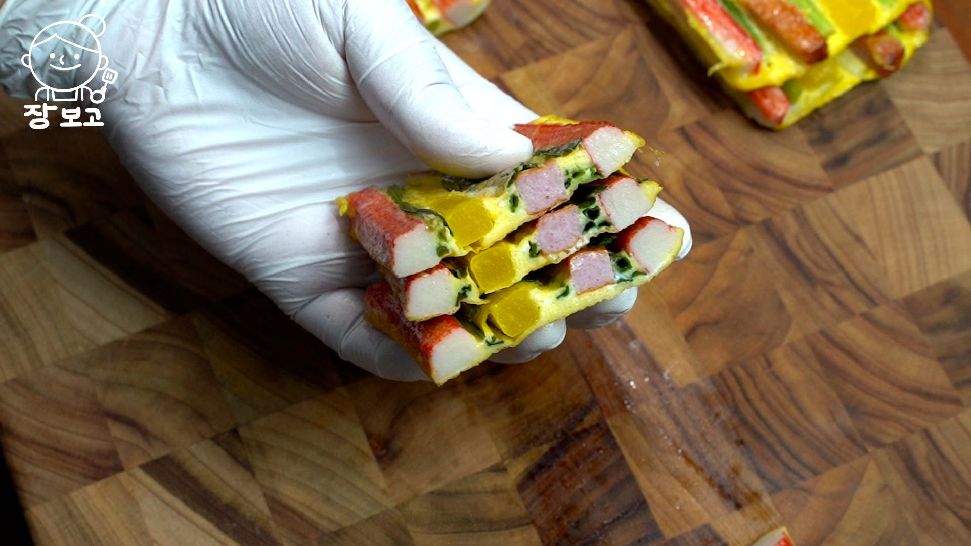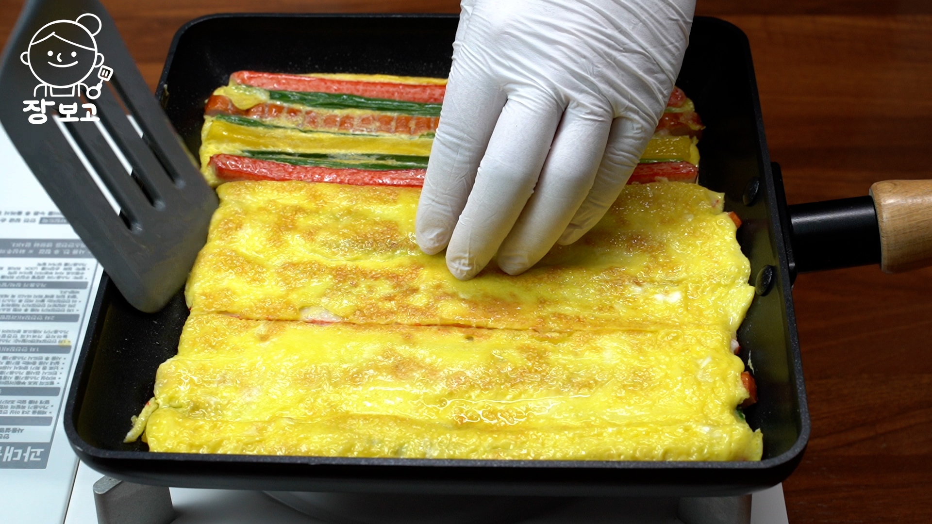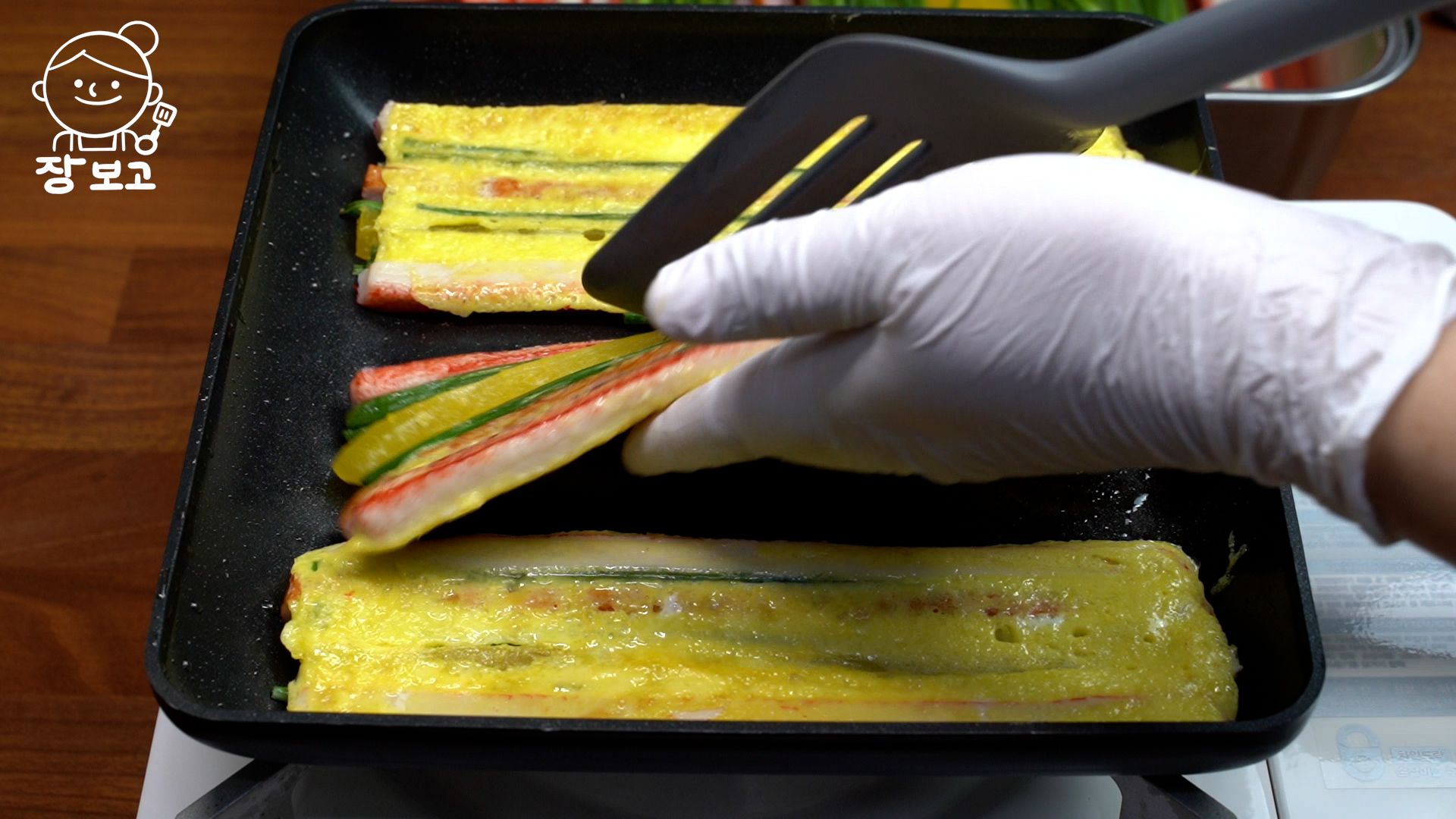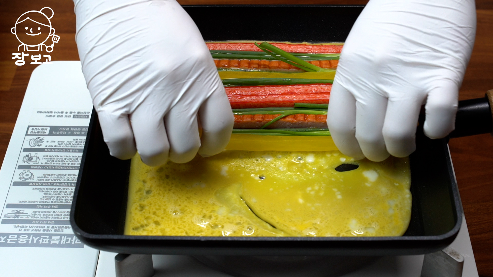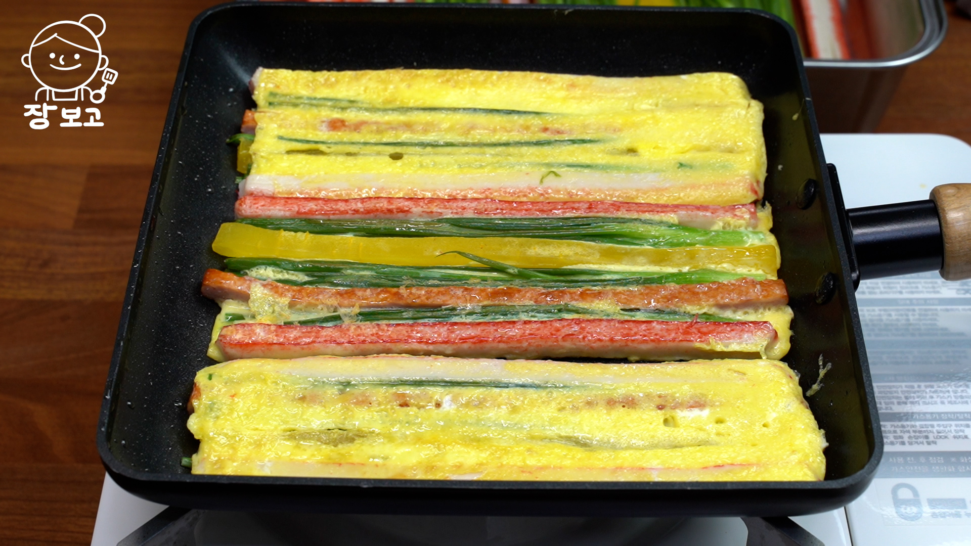 3. 약불에 팬 올리고 기름 두르고 계란물을 붓고 재료를 올린다. 맛살->쪽파->햄->쪽파->단무지->쪽파->맛살 순으로 올리면 색이 예쁘다.
