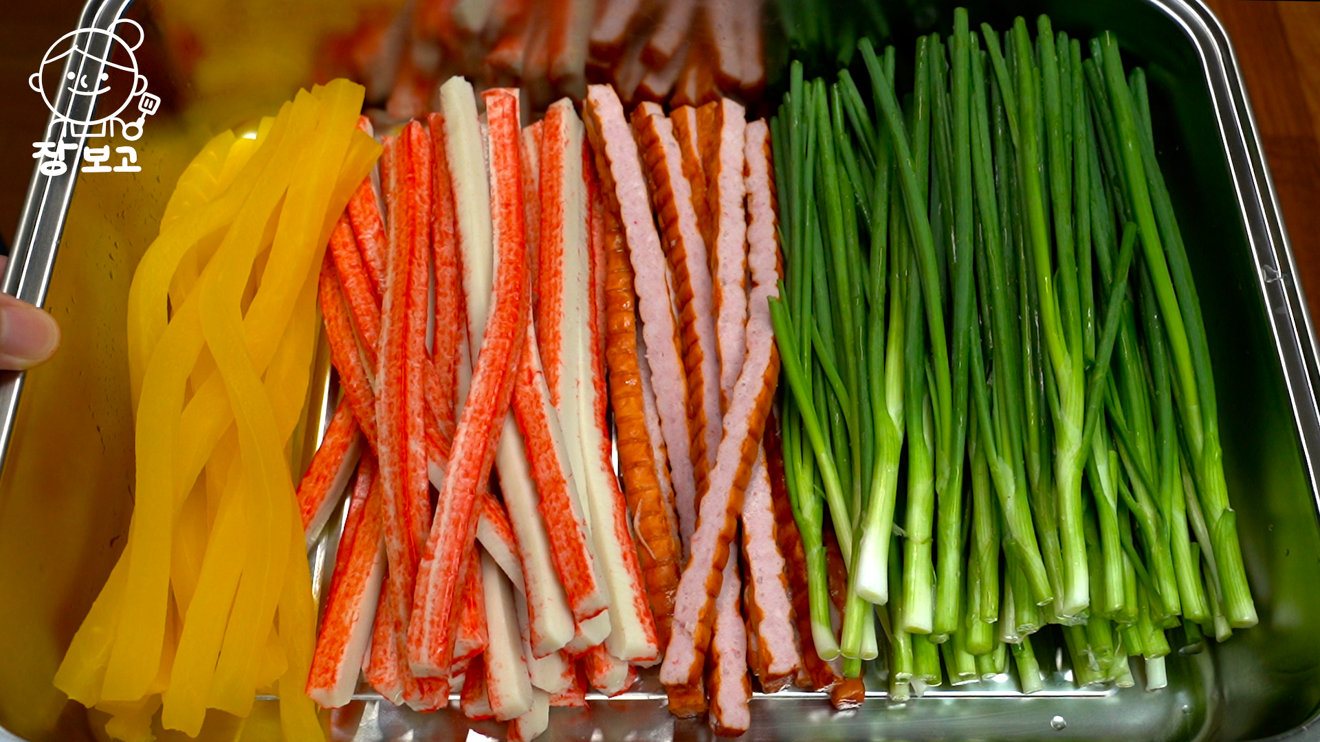 맛살, 김밥용햄, 단무지, 쪽파, 감자전분, 계란, 포도씨유