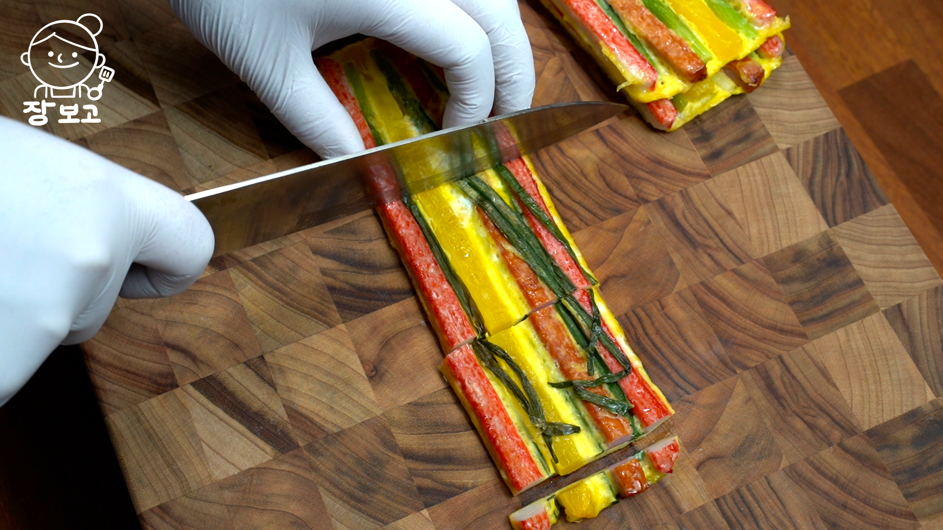 6. 반복한다. 레시피 대로 만들면 총 12줄 나오며, 3등분으로 썰면 36개의 꼬지전이 나온다.