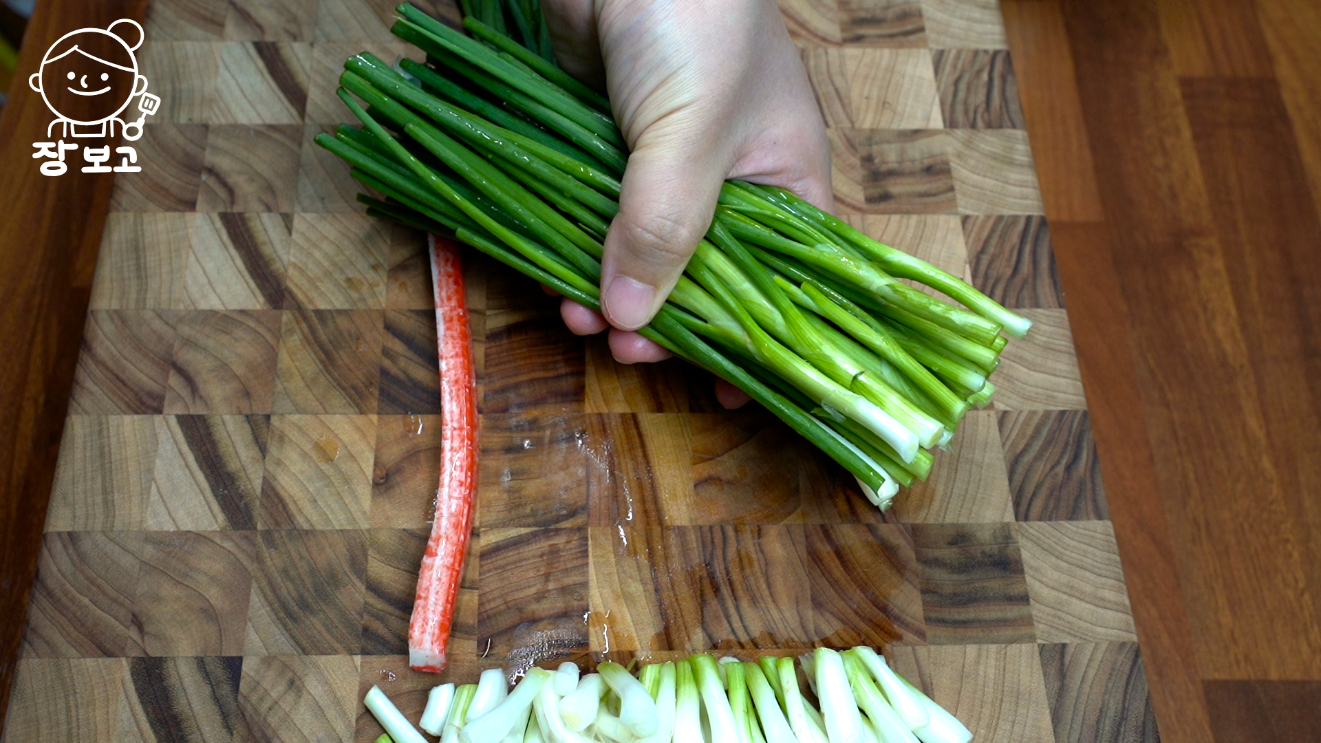 2. 맛살은 반으로 길게 썬다. 김밥용햄도 눈금에 따라 썬다. 쪽파는 맛살 길이와 동일하게 자른다. 단무지는 키친타월로 물기를 제거한다.