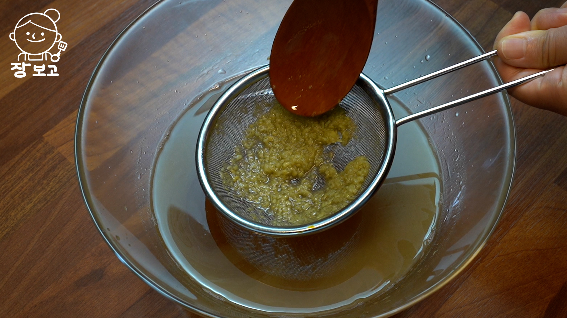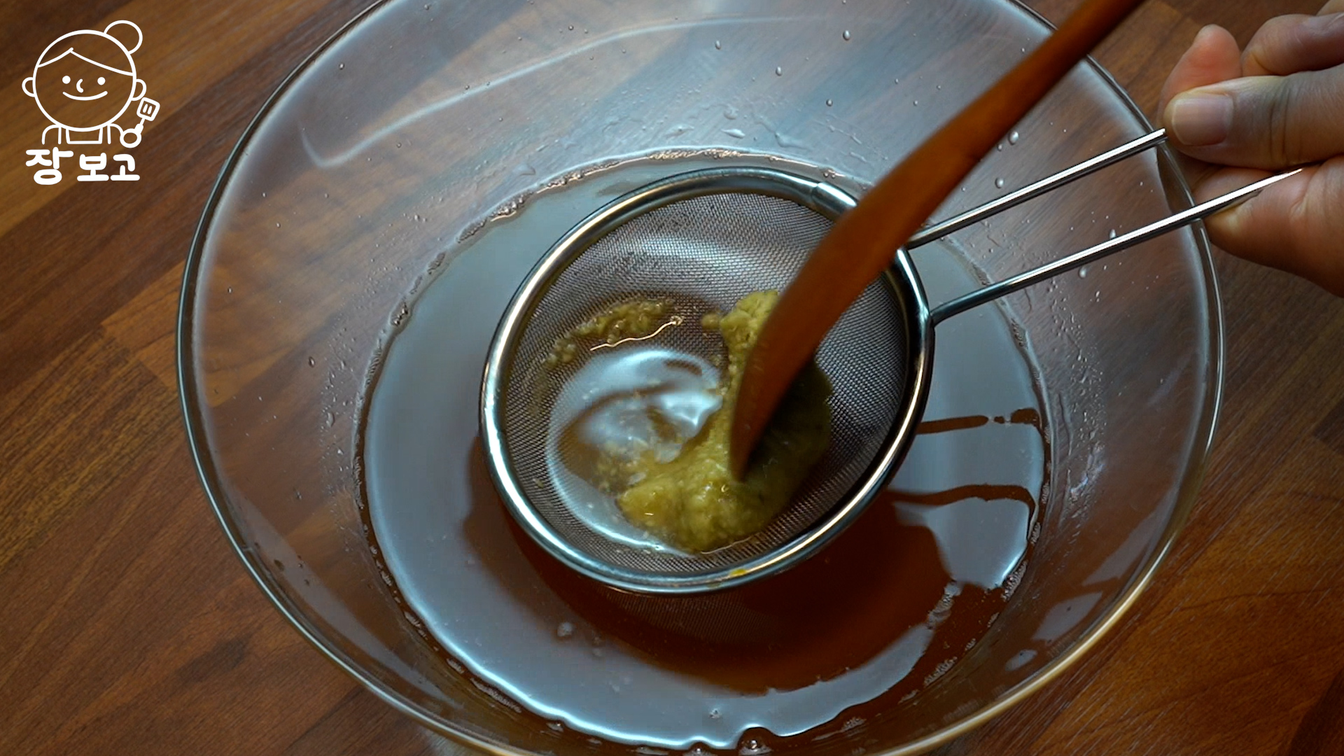 3. 볼에 매실청, 물, 식초, 천일염을 넣고 잘 저어준 뒤 채를 올려 고추냉이를 갠다. (톡 쏘는 와사비맛을 원한다면 3~5큰술 넣어도 된다)