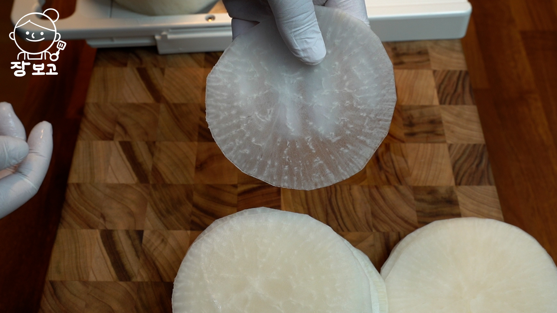 재료 무 2kg 식초 3큰술 소금 2큰술 매실청 4컵 (800ml) 1. 무는 껍질째로 깨끗이 씻어 물기 제거한다. 지저분한 부분만 감자칼로 깎아낸다. 2. 양쪽 끝을 정리하고, 길게 반을 잘라 얇게 슬라이스 한