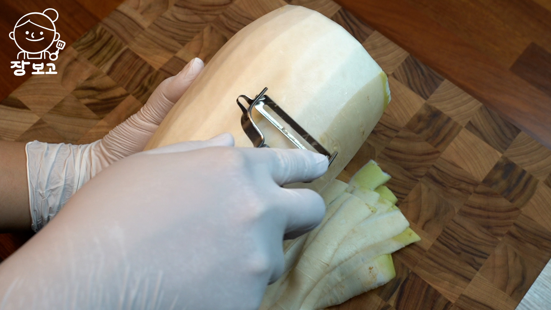 1. 무는 감자칼로 껍질 벗기고 얇게 슬라이스 한다. 세척한 깻잎은 가위로 꼭지를 잘라준다. 반으로 접어 가위로 자르면 깔끔하다.