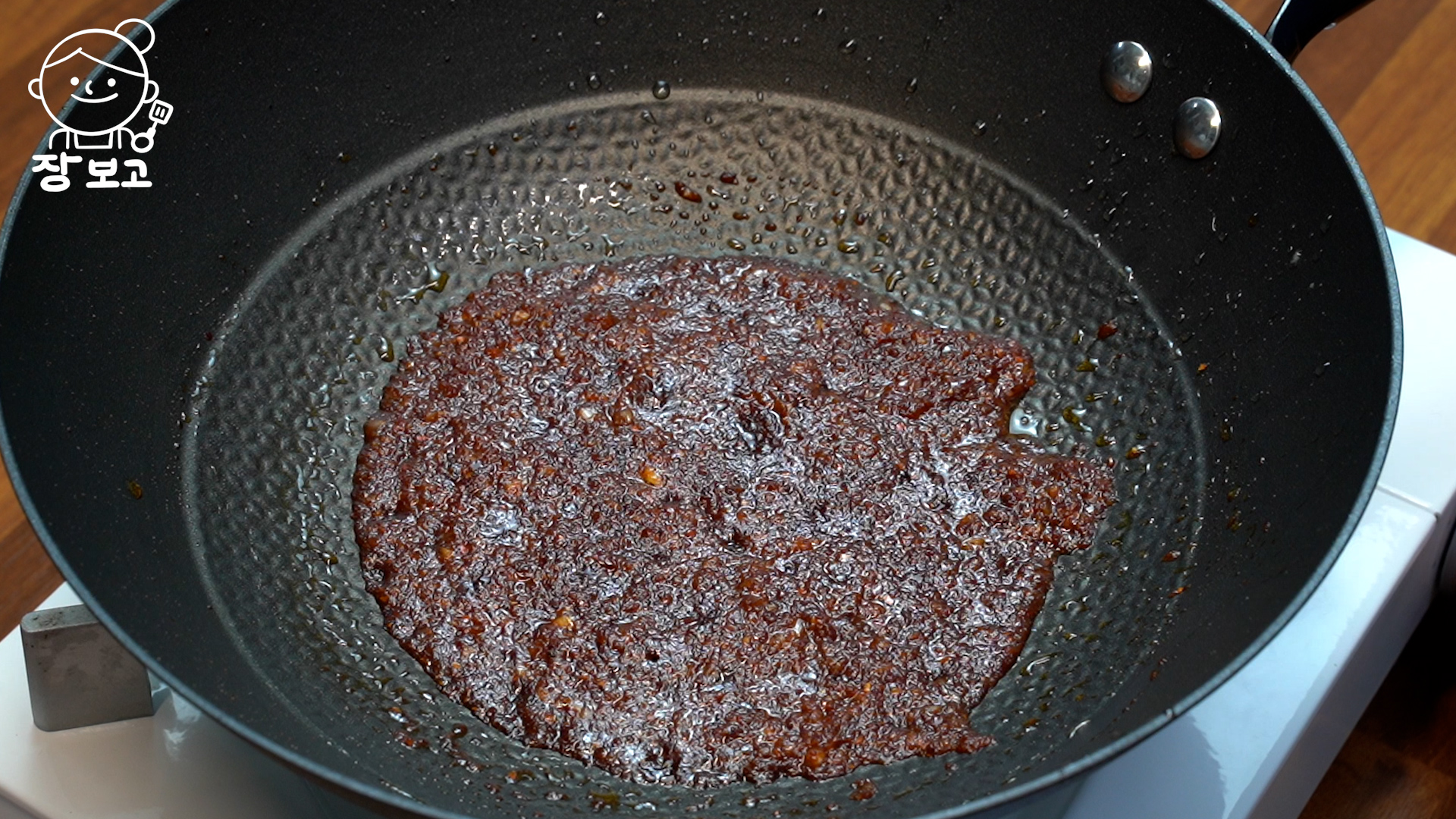 3. 웍에 식용유 4큰술, 다진 마늘 1 큰술, 진간장 3 큰술, 물엿 2 큰술, 미림 1 큰술, 고춧가루 2 큰술, 후추 약간 넣고 섞은 뒤 바글 끓인다. 이렇게 하면 고춧기름이 뽑아져 나옴과 동시에 양념장이 하나로 잘 융화된다.