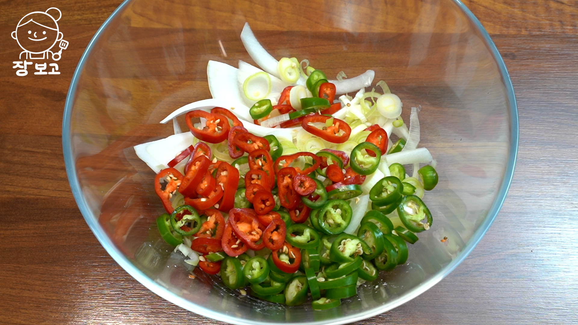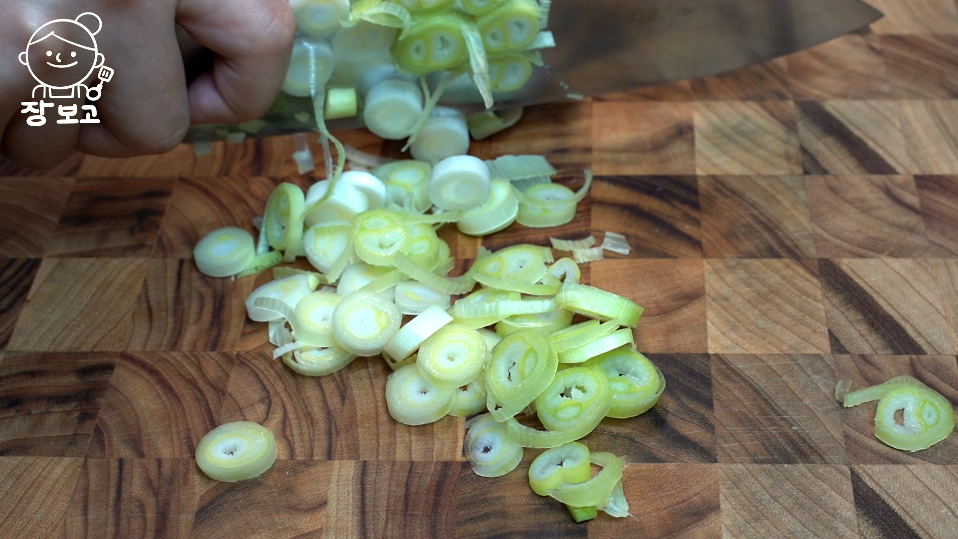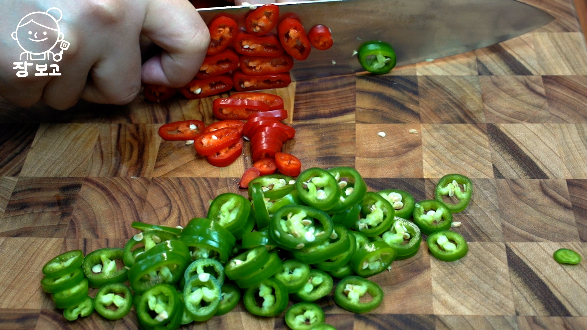 2. 양파 1/2개 얇지 않게 채 썰고, 대파는 송송 썬다. 청 홍고추는 동그란 모양으로 썬다.