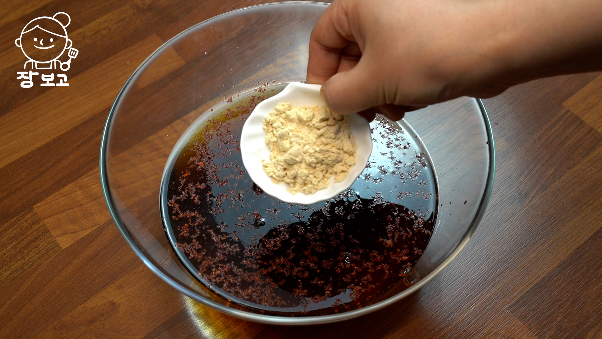 4. 볼에 물, 진간장, 미림, 고춧가루, 다진 마늘, 양파가루 넣고 잘 저어준다. 양파가루를 넣으면 달큼한 맛과 감칠맛이 난다. 양파가루가 없다면 양파를 1/4개 썰어 넣거나 설탕을 반 큰 술 넣으면 된다.