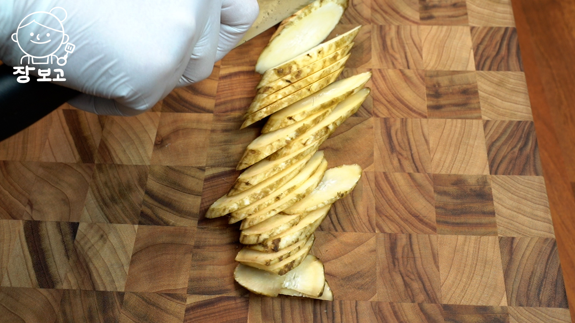 2. 마르고 질긴 끝 부분은 제거하고 성냥개비 두께로 채 썬다. 써는 동안 갈변이 된 우엉은 물에 5분간 담근다.