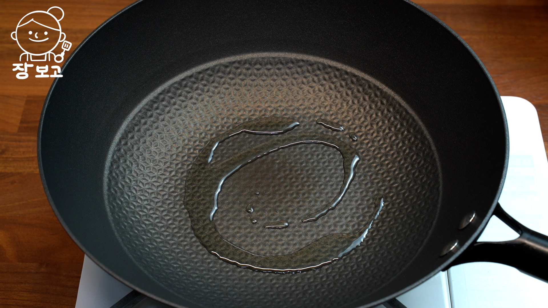 4. 웍에 식용유 3큰술 넣고 우엉을 넣어 중불에서 3분간 볶는다. 우엉 숨이 죽으면 원당 1큰술 넣고 3분 볶는다. (*원당은 비정제설탕이다. 원당이 없으면 설탕 사용)