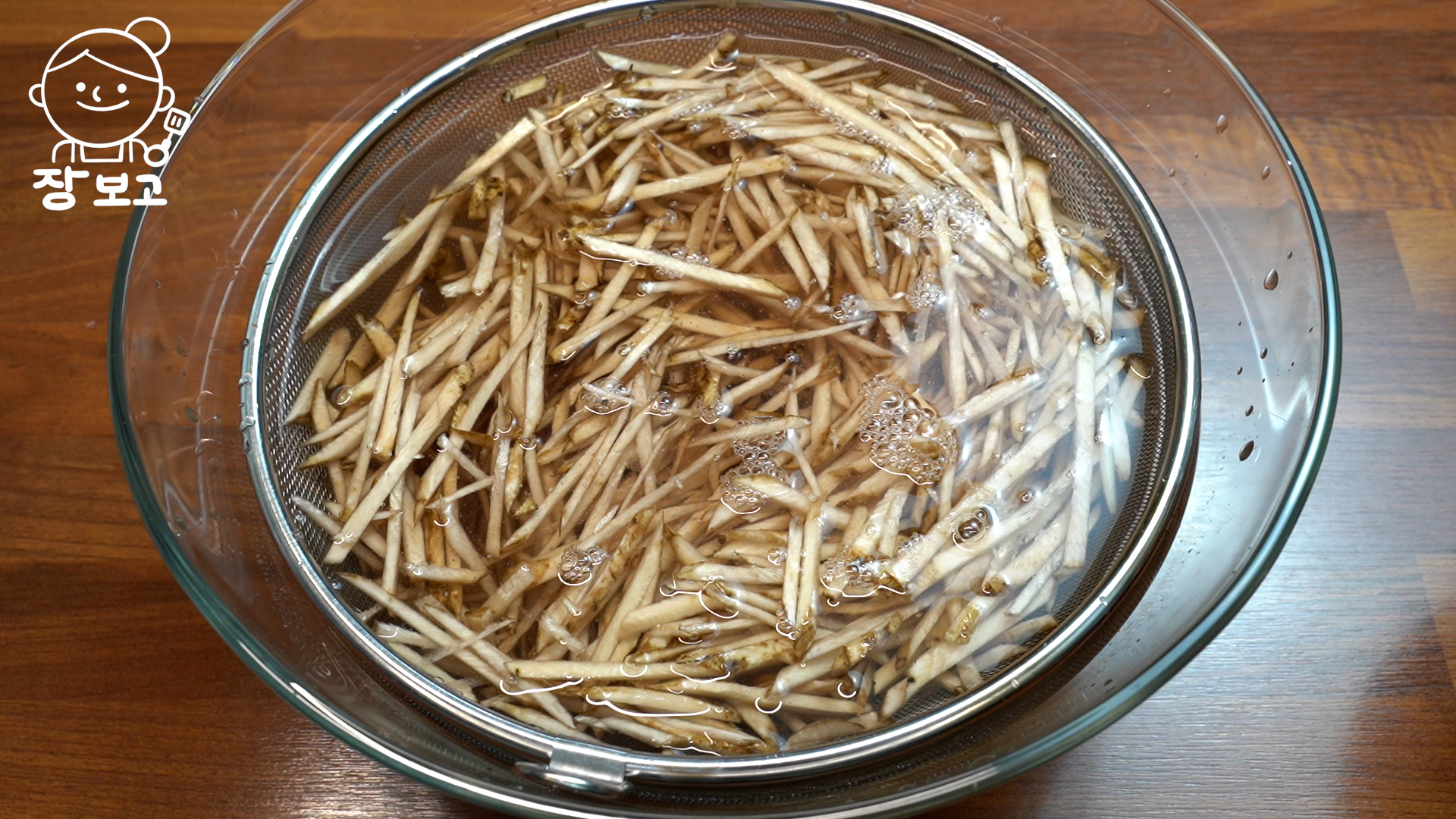 3. 하얘진 우엉은 물기를 털어 잠시 대기한다.