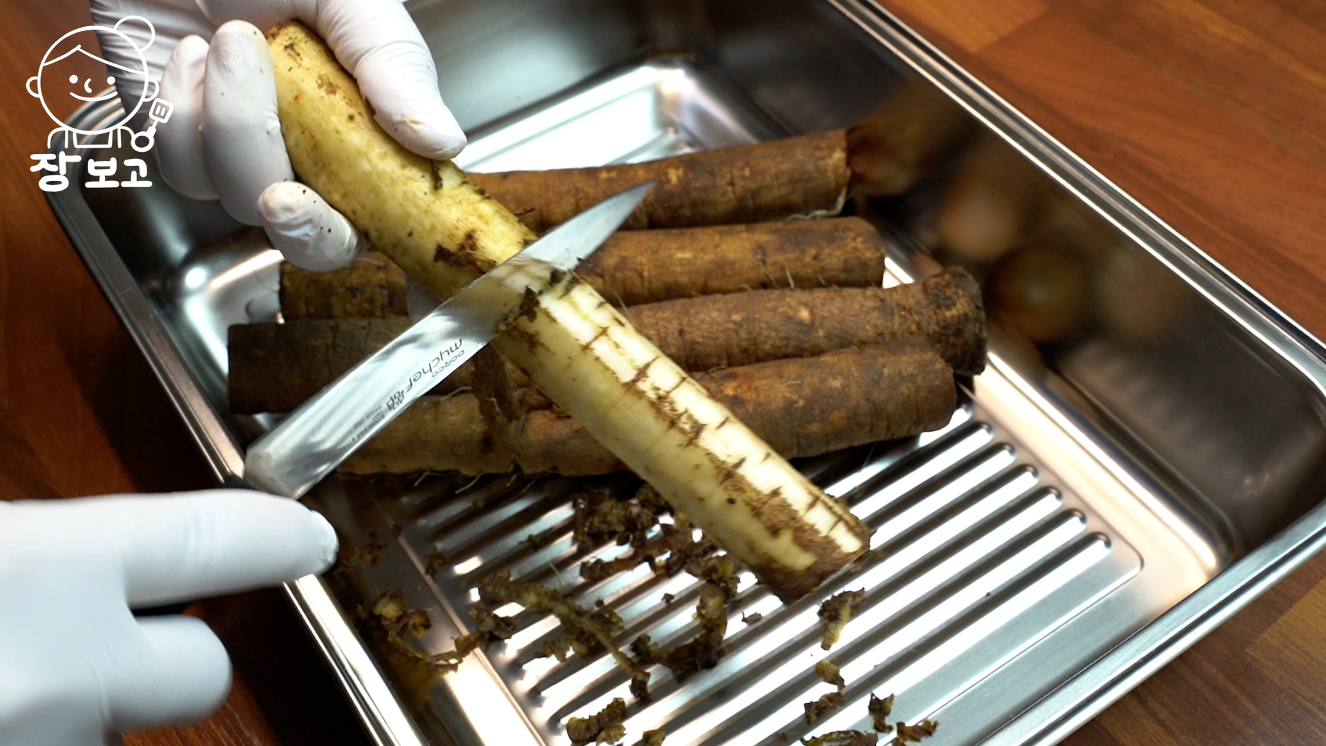 1. 칼등으로 우엉 껍질을 슥슥 벗겨서 가볍게 물에 헹군다. (필러는 쓰지 않는다. 껍질에 영양가가 많고, 살점이 너무 많이 떨어져 나간다)